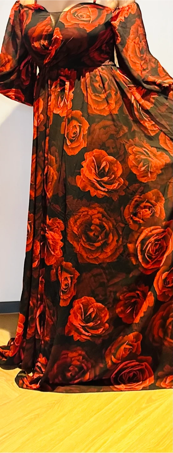 Gorgeous off-the-shoulder maxi dress featuring a bold red rose print on a black background. It's made from a lightweight, flowing fabric perfect for warmer weather or special occasions. The puff sleeves add a touch of dramatic flair!