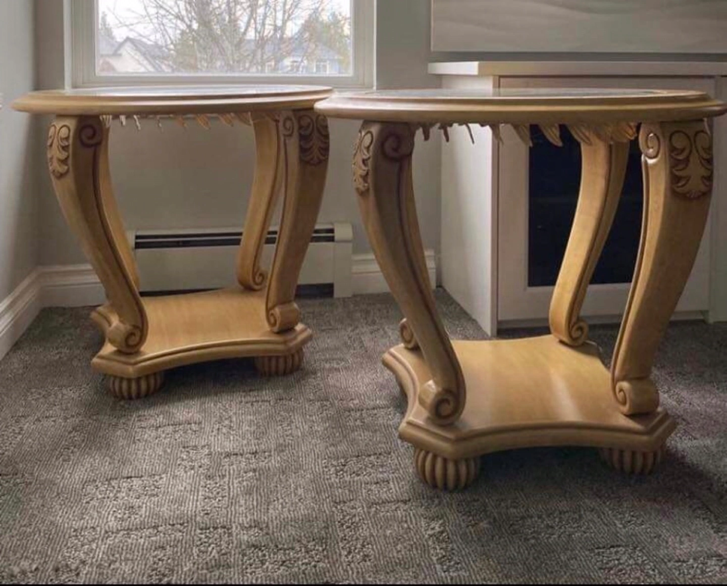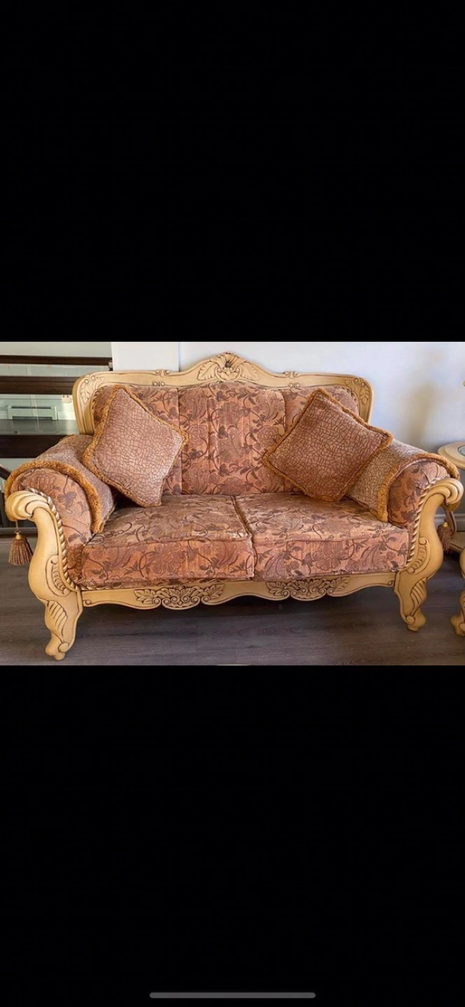 Selling a sofa set with matching end tables and a coffee table. The set includes a three-seater sofa, a loveseat, a chaise lounge, two end tables, and a coffee table. All pieces are in good condition and have a unique, classic design. Perfect for adding a touch of elegance to your living room!