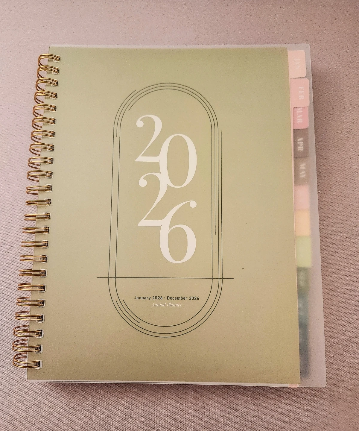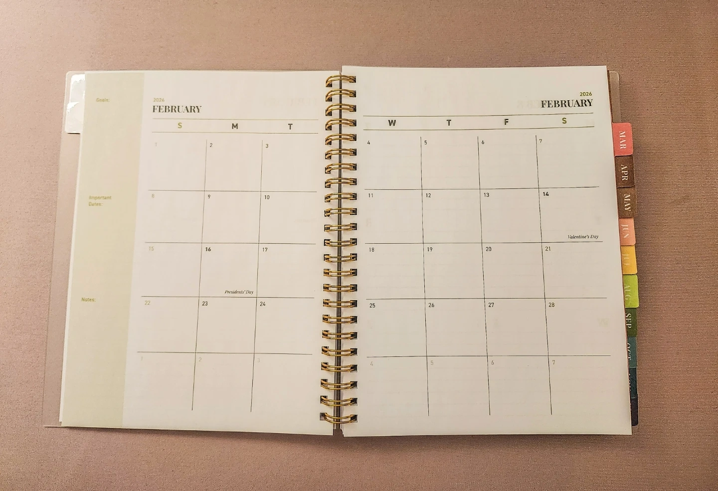 This is a 2026 annual planner. It features monthly, weekly, and notes sections. The planner runs from January 2026 to December 2026. Januarys calendar is missing. But February to December is all new and intact. It's wire-bound with tabbed dividers for easy navigation.