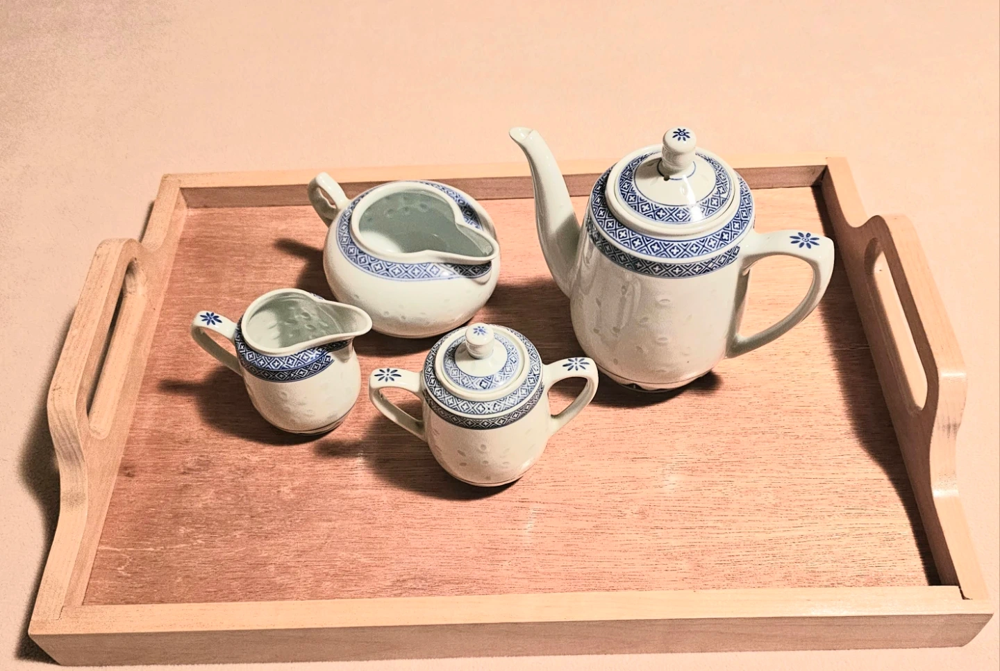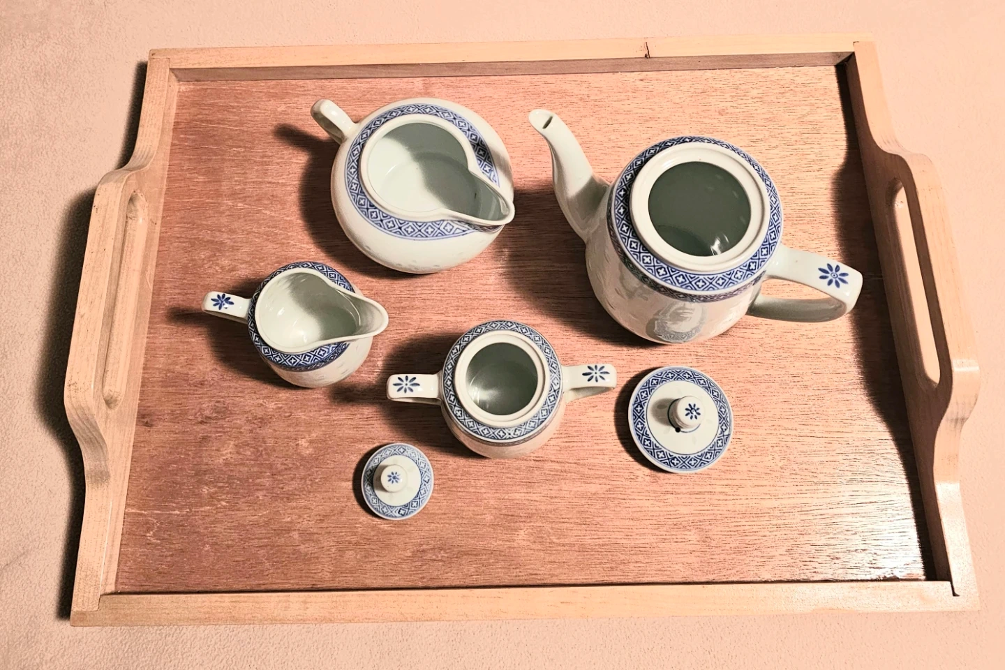 Selling a lovely Jingdezhen teapot set with a delicate rice grain pattern! It includes a teapot, 2 different sized creamer/milk pitchers, sugar bowl, and two lids. The set is in excellent condition and would be a charming addition to any tea lover's collection $10 for all 6 pieces