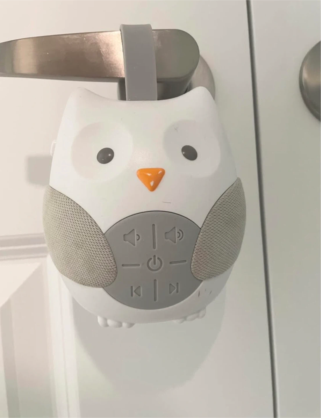 This Skip Hop owl sound machine is perfect for creating a calming atmosphere for little ones. It plays various soothing sounds and lullabies to help with sleep. It's portable and easily attaches to strollers or cribs. Includes a grey fabric strap for hanging.