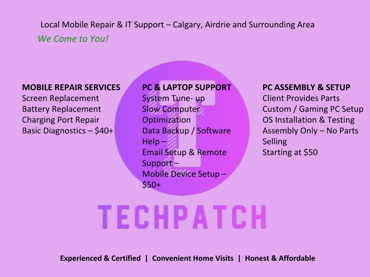 Need a hand with your tech? TechPatch provides professional, Device repair and IT support for homes and small offices in Calgary, Airdrie and Surrounding Area.