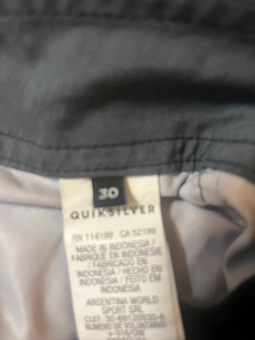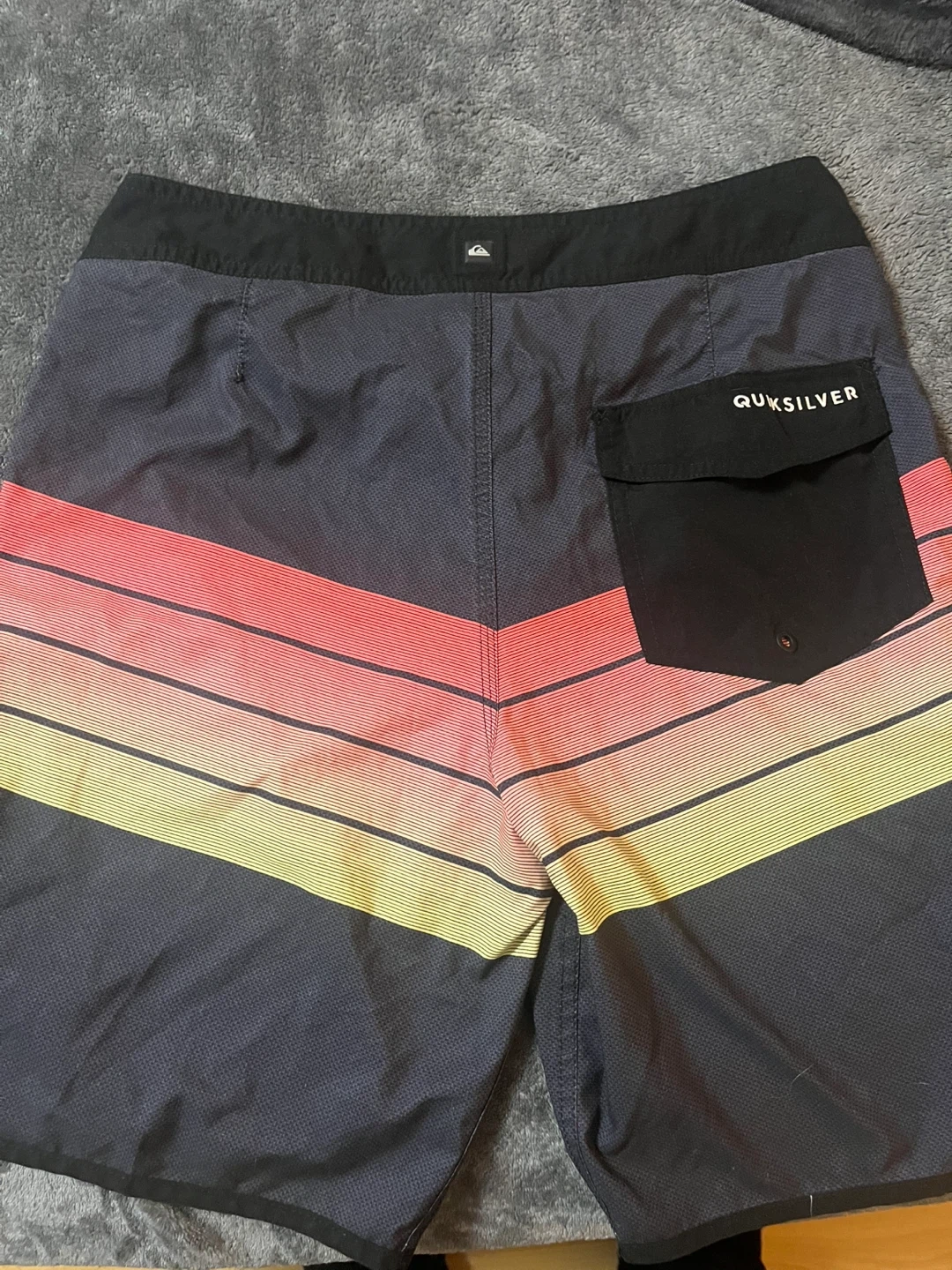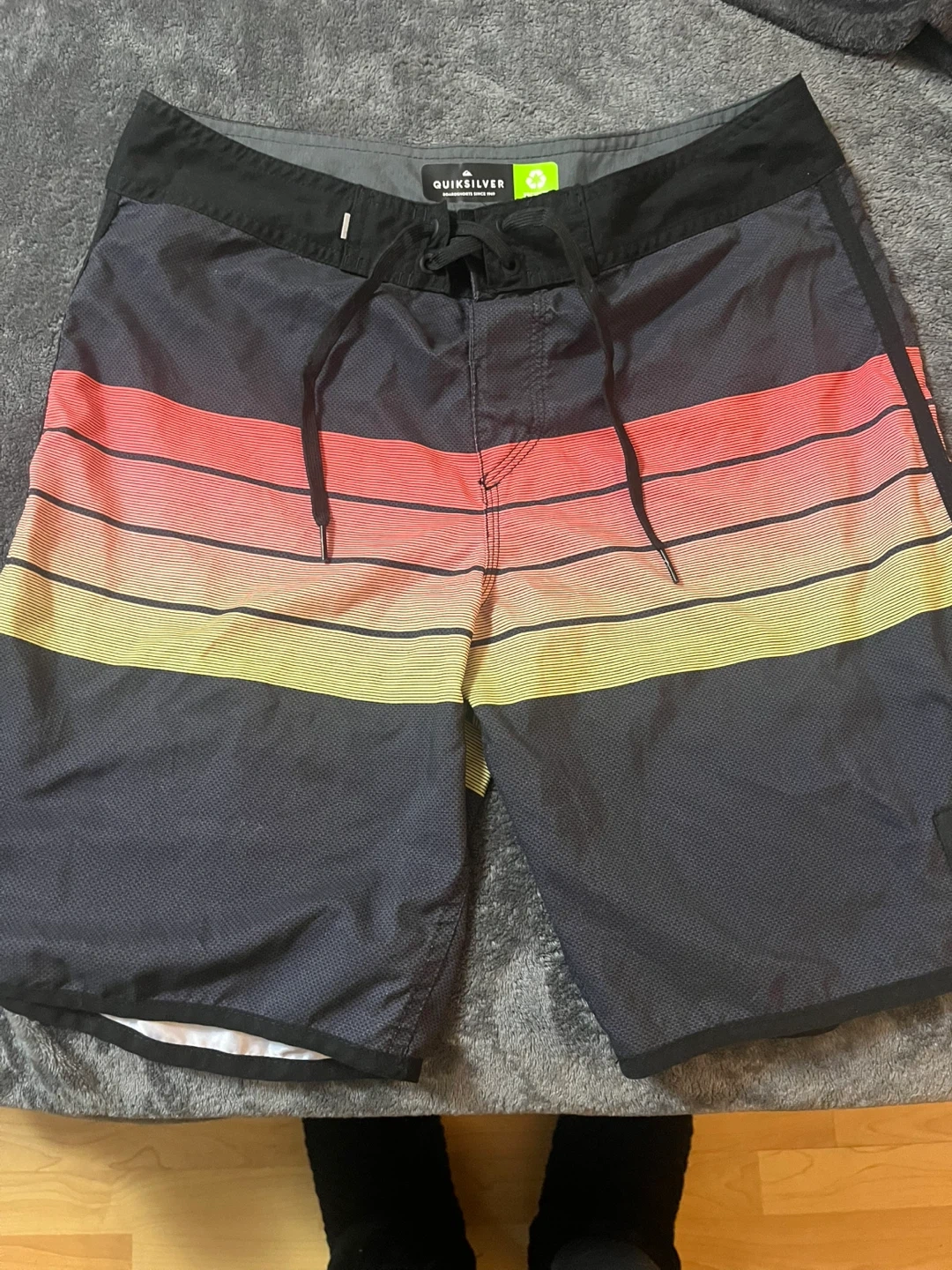 Quiksilver board shorts with a colourful stripe design. Features a drawstring waist and a back pocket. Made in Indonesia.