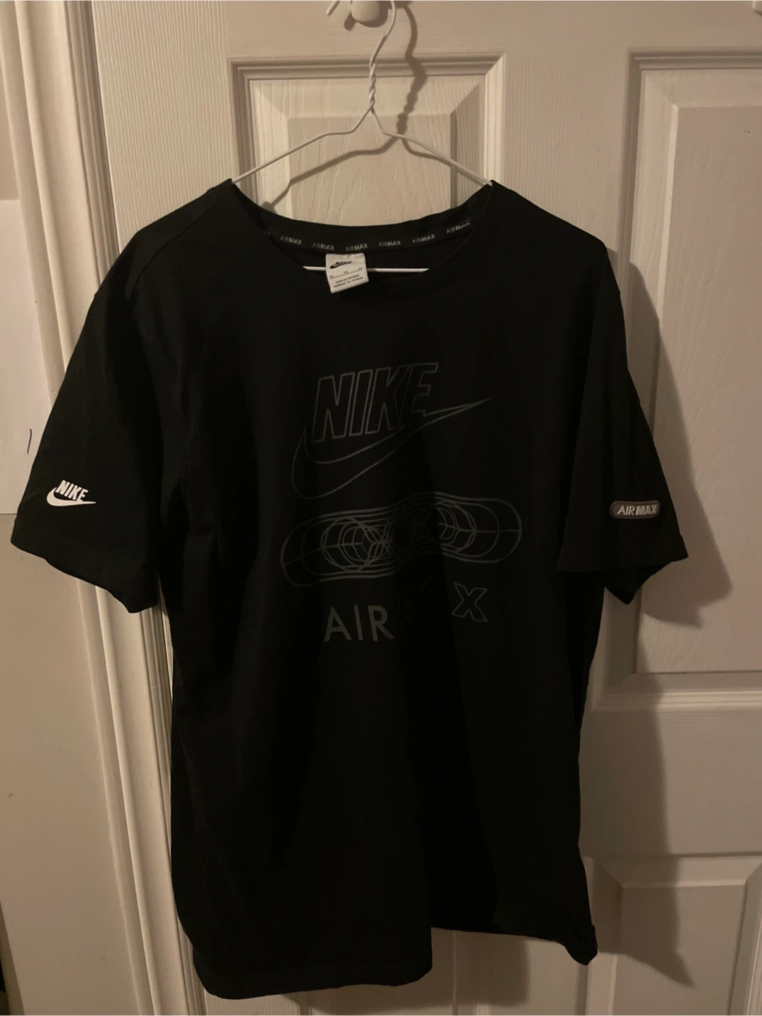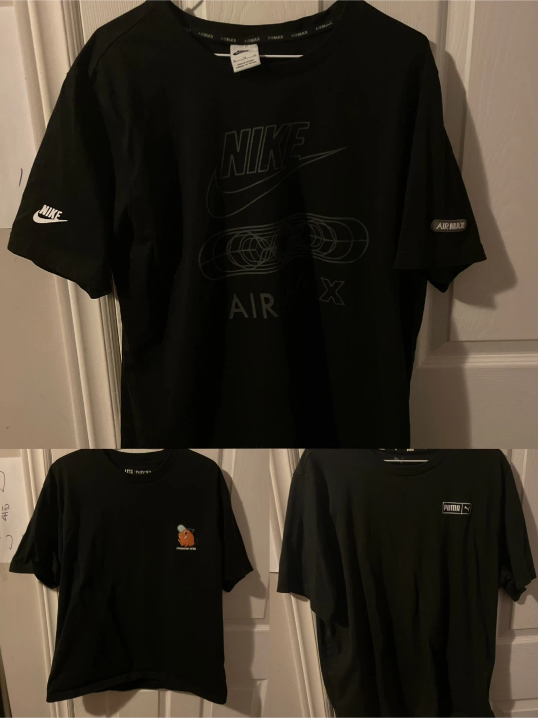 Bundle includes one black Nike Air Max t-shirt, one black Puma t-shirt, and one black t-shirt with a small Chainsaw Man graphic. All shirts are size medium. Great for everyday wear!