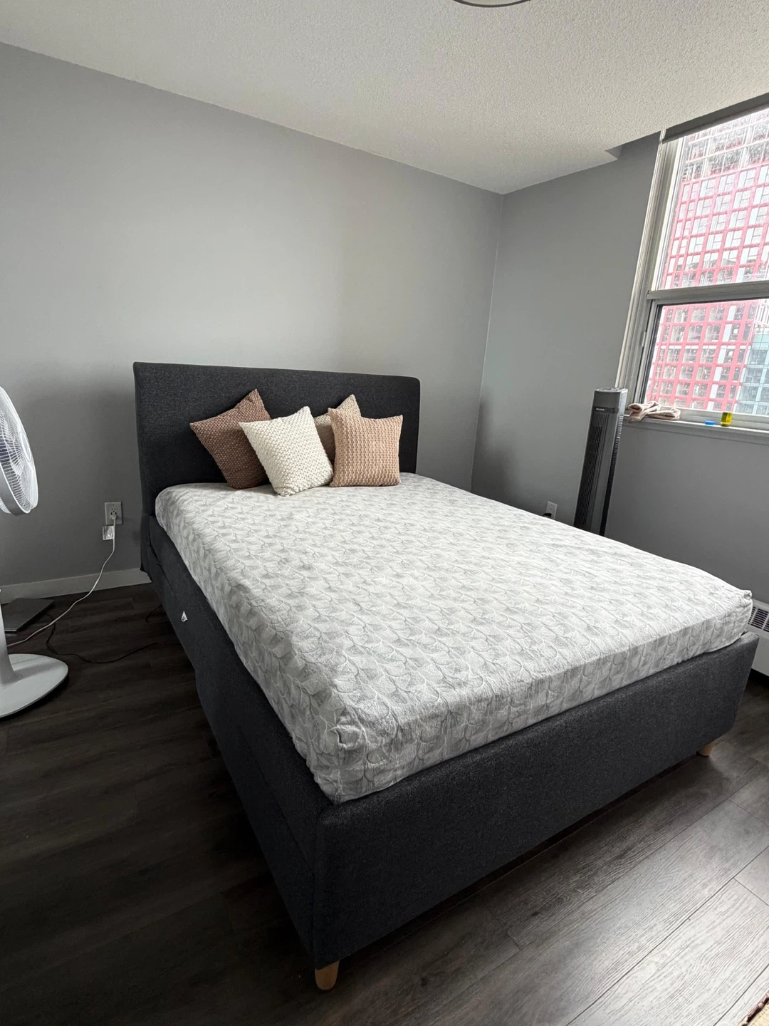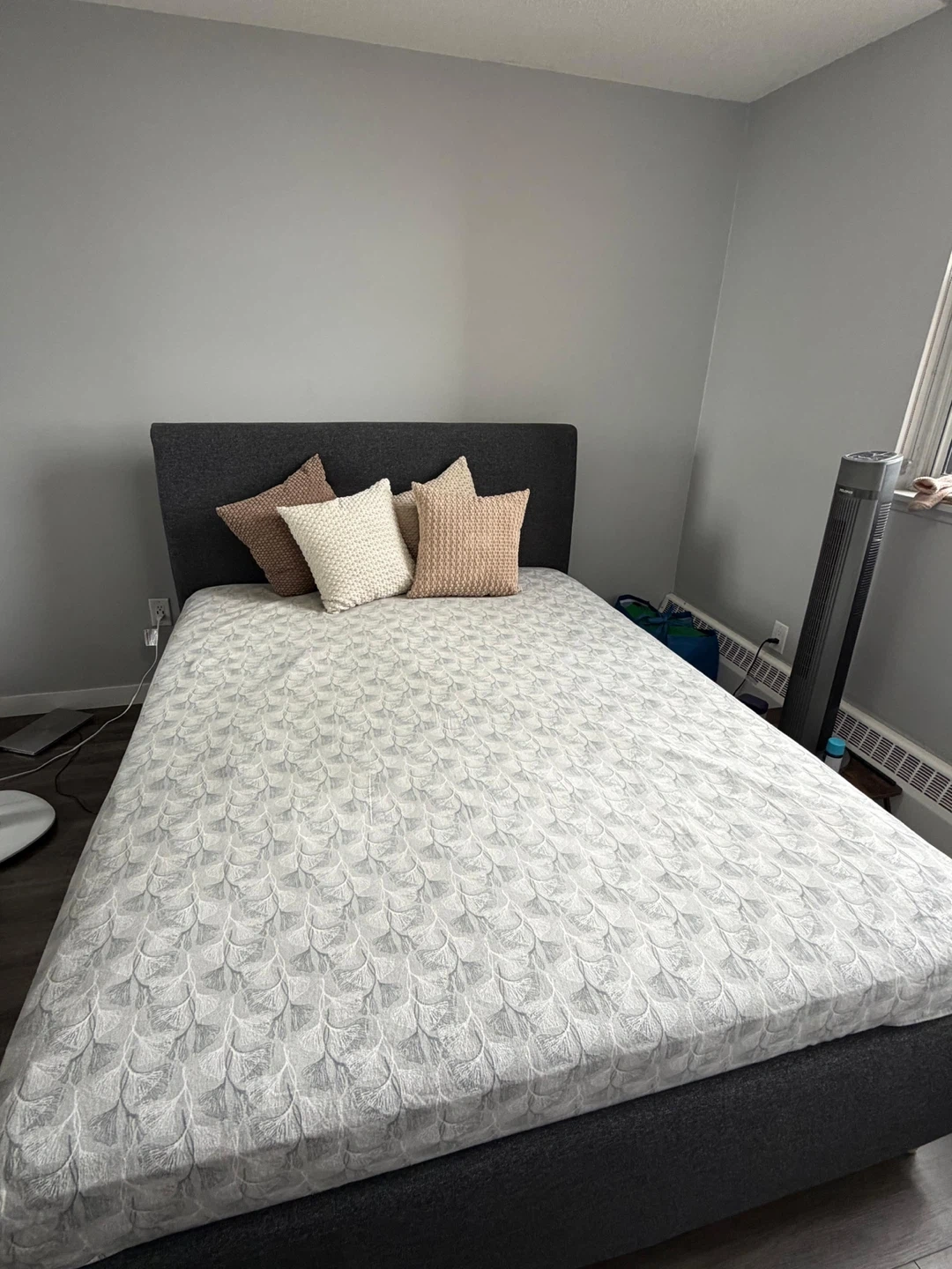 Selling a queen size bed frame in great condition! The bed frame is a stylish grey colour and would be a great addition to any bedroom. It's very sturdy and has been well taken care of. Ready for a new home!