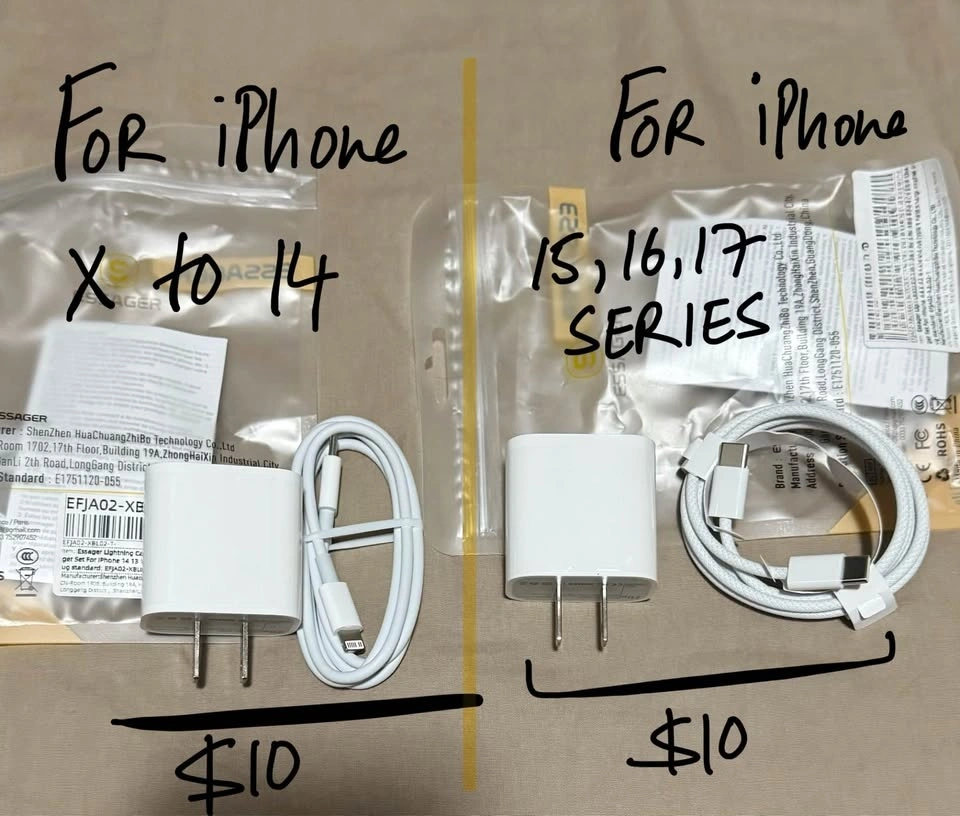 Charger and cable set, $10 per set. Compatible with all iPhones (Lightning or Type-C). This is a new product for pickup only. I am near 255 Tache Ave in St Boniface. I can share the exact address when you're on your way. Please check out my other ads too. Thank you.