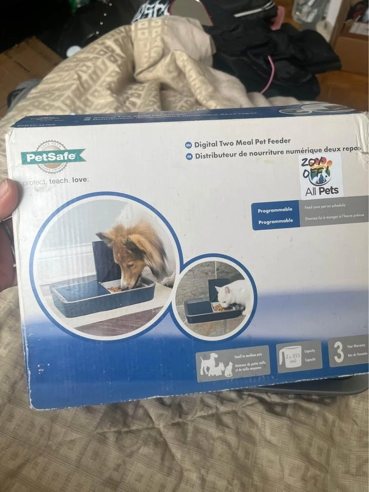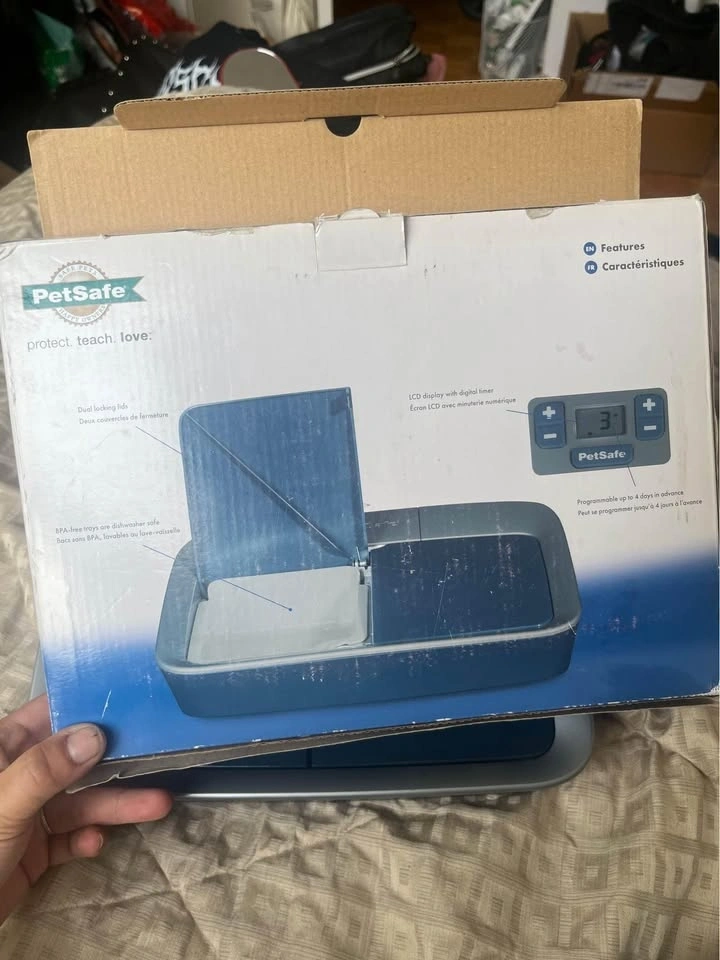 Pet Safe Digital Two Meal Pet Feeder for Small to Medium Pets. Two Meals (355 mL), works on a timer based schedule. Dual locking lids, LCD display with a digital timer, BPA-free trays that are dishwasher safe. Programmable up to 4 days in advance. Used maybe once or twice. Just don’t use/need it anymore. Pick up only.