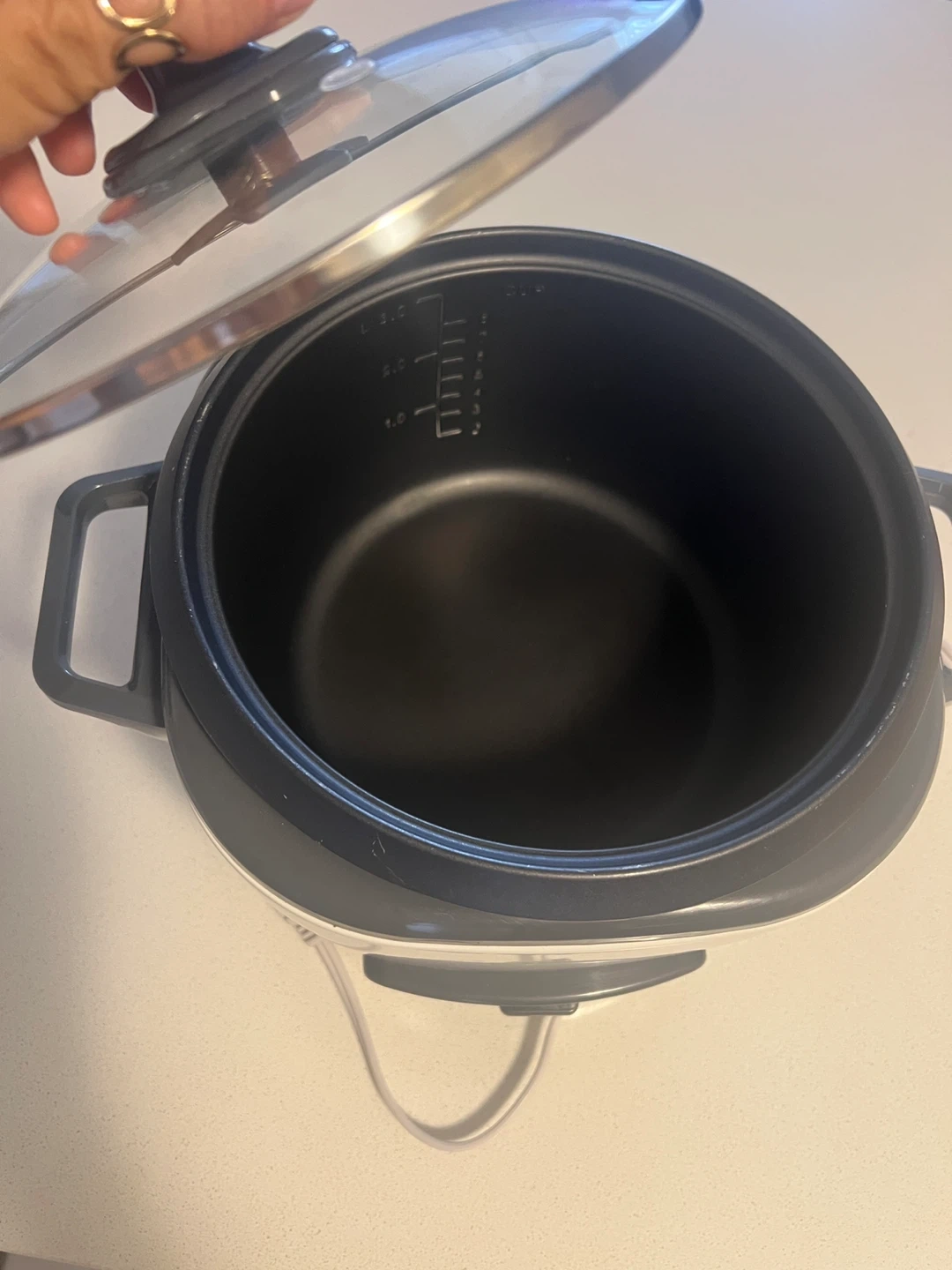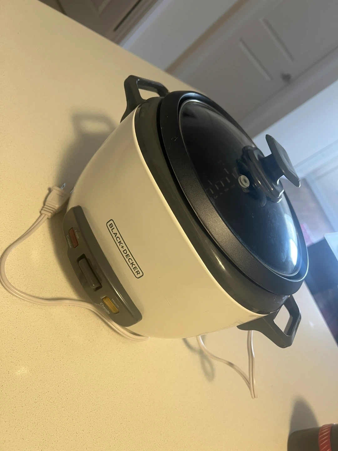 This Black+Decker rice cooker has a 8-cup capacity. It includes a non-stick inner pot and a glass lid. It's perfect for making rice at home!