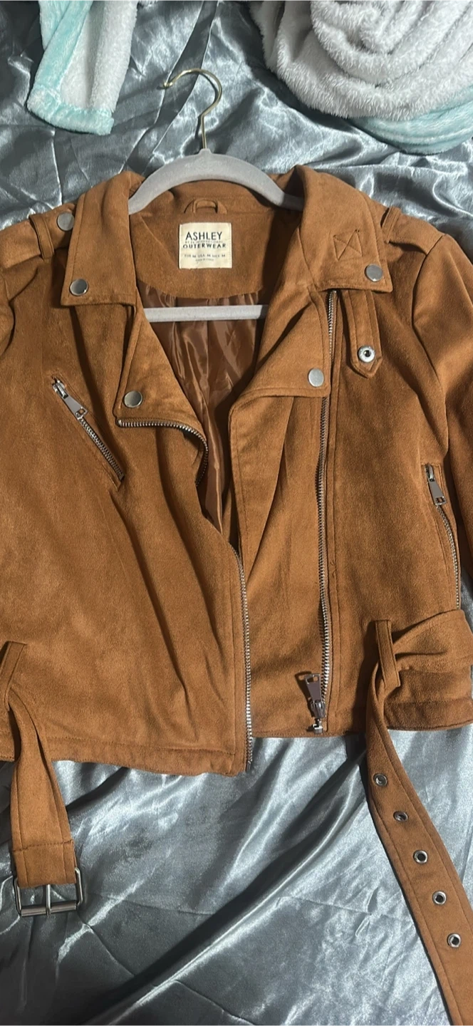 I'm selling an Ashley Outerwear jacket in a stylish brown color. It's a size M and has a unique design with zippers and a belt. This jacket is perfect for adding a touch of style to any outfit!