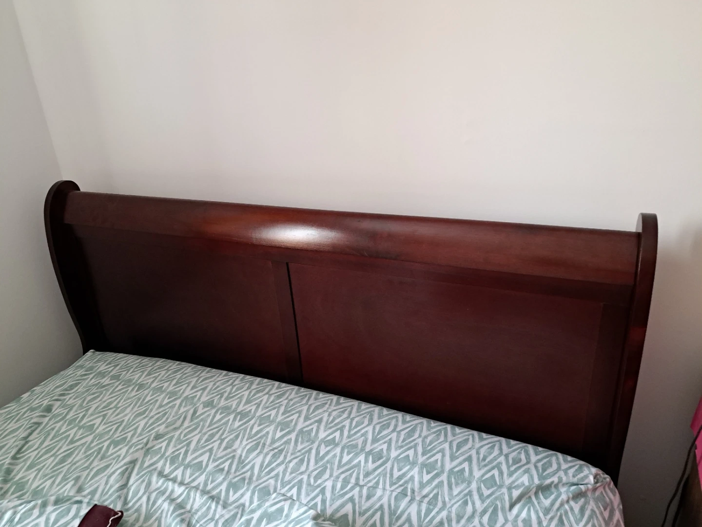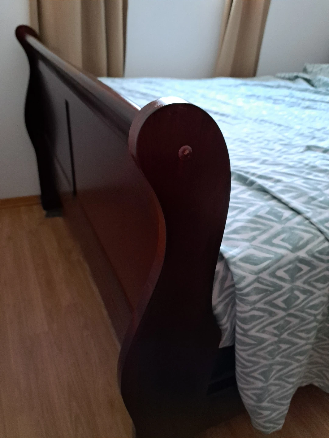 A classic dark wood sleigh bed frame with a smooth finish. This bed frame comes with a headboard and footboard, and has a slatted base for mattress support. It's a sturdy and timeless addition to any bedroom.