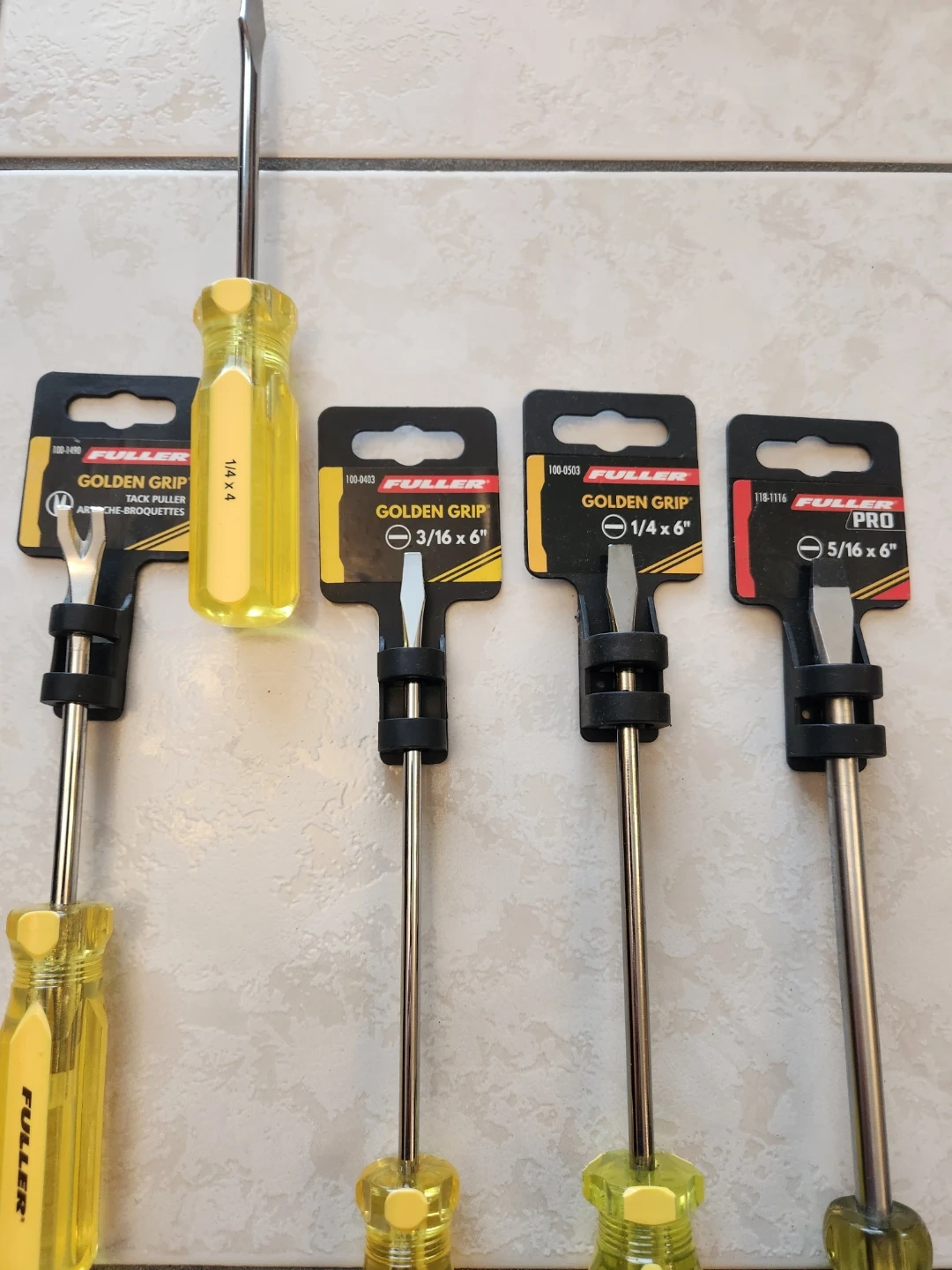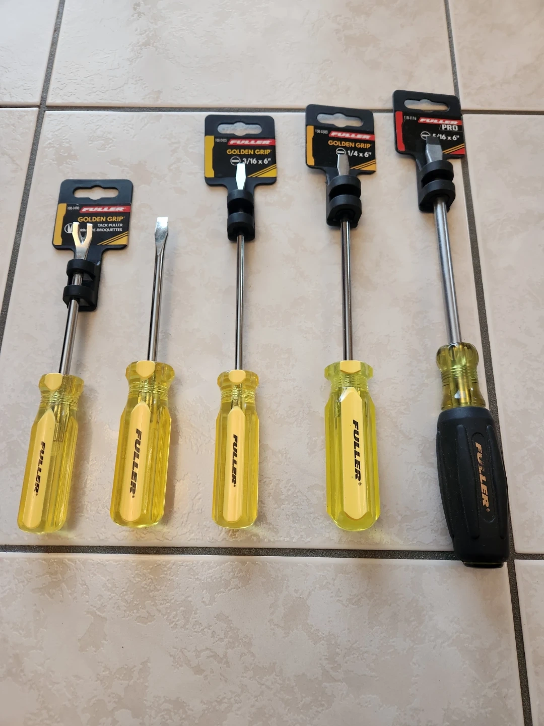 Set of five Fuller Golden Grip screwdrivers. Includes one 1/4 x 4 " drive and four "Golden Grip" screwdrivers in sizes 3/16 x 6", 1/4 x 6", and 5/16 x 6". One screwdriver has a black handle, the others are yellow.