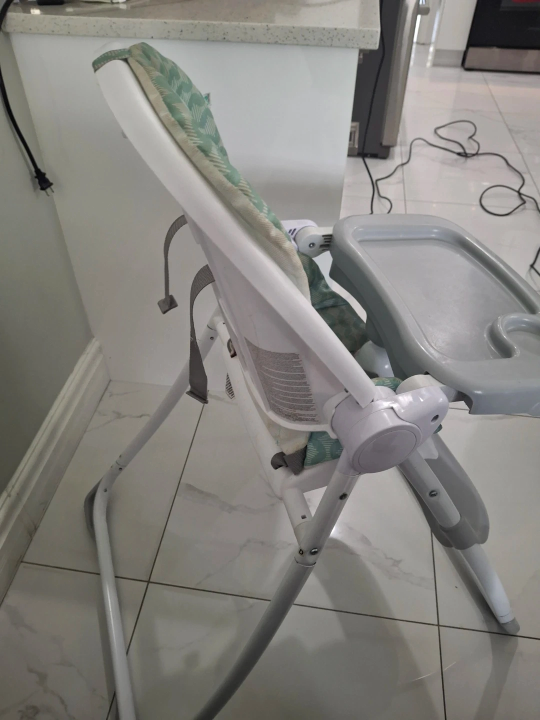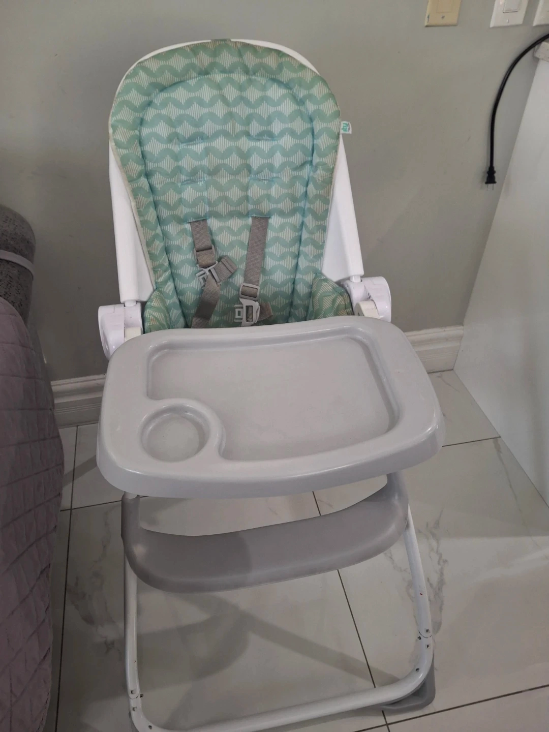 A baby high chair with a removable tray and a comfortable padded seat. It features a 5-point harness for safety. The chair's frame is white with grey accents and the seat pad has a green geometric pattern. It's designed for easy cleaning and storage. Great for meal times!