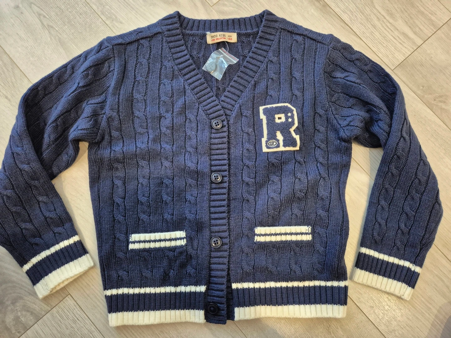 This is a blue cable knit cardigan for kids.