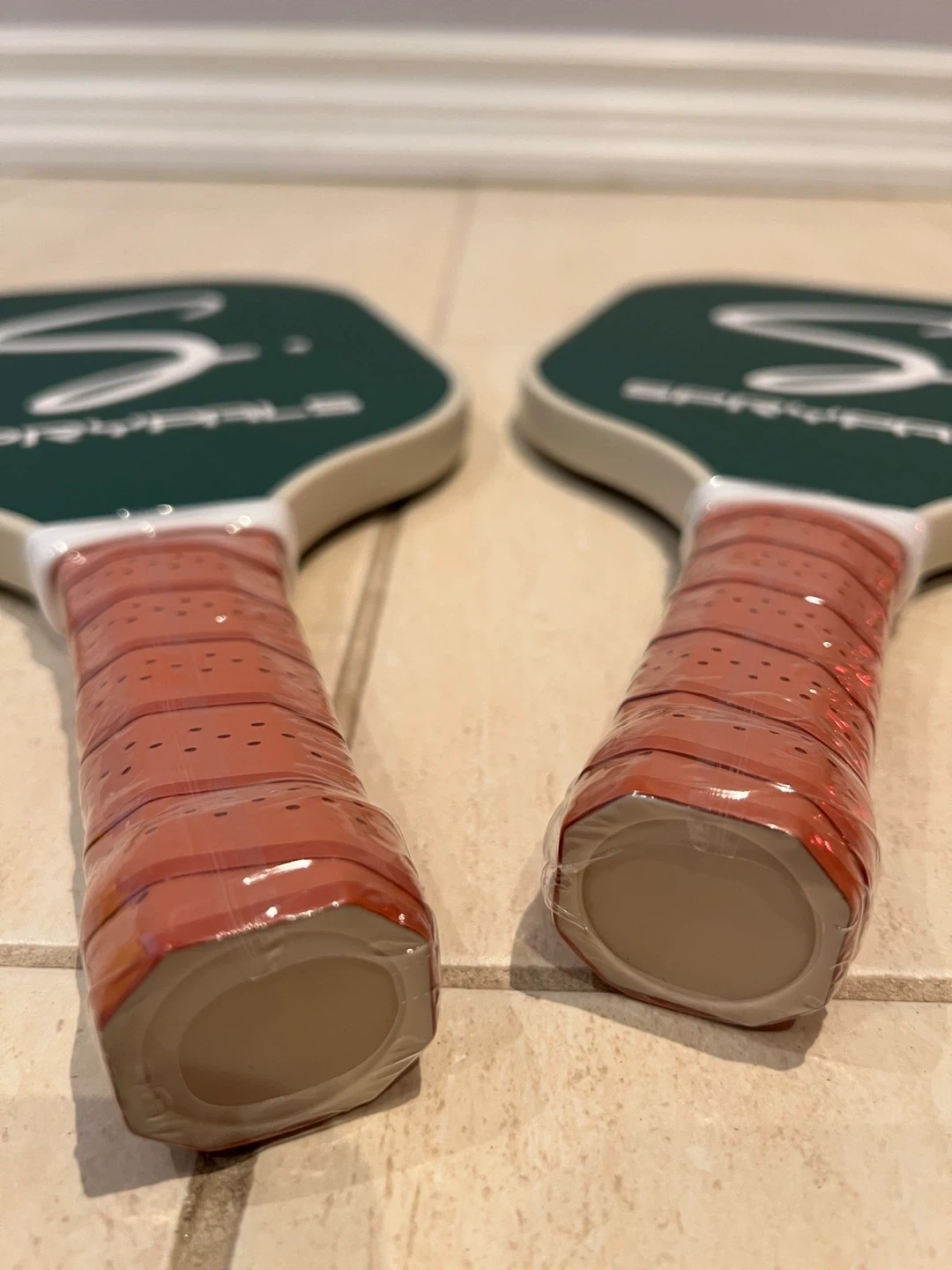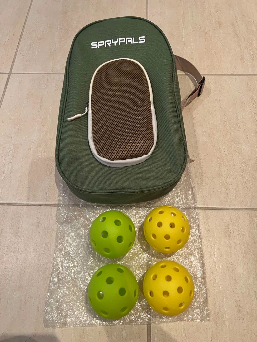 This set includes two SPRYPALS pickleball paddles and four pickleballs, two green and two yellow. It also comes with a green carrying bag. The paddles are USA Pickleball Approved. This set is great for starting out or for casual games!