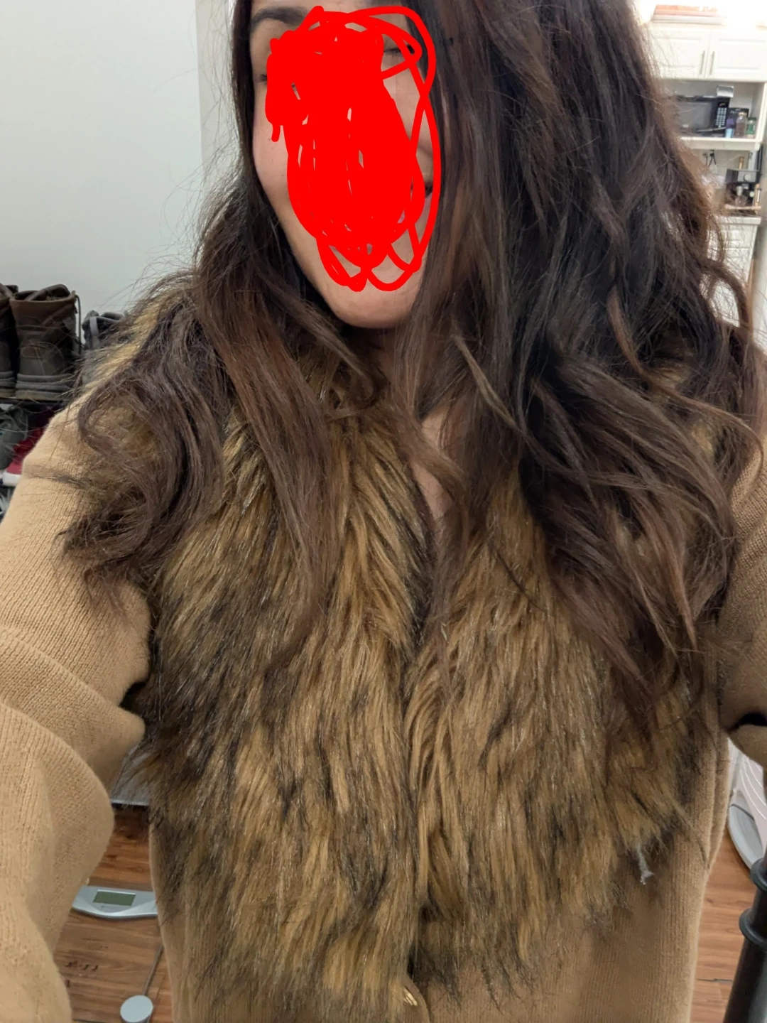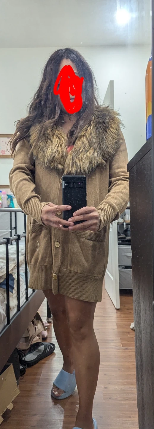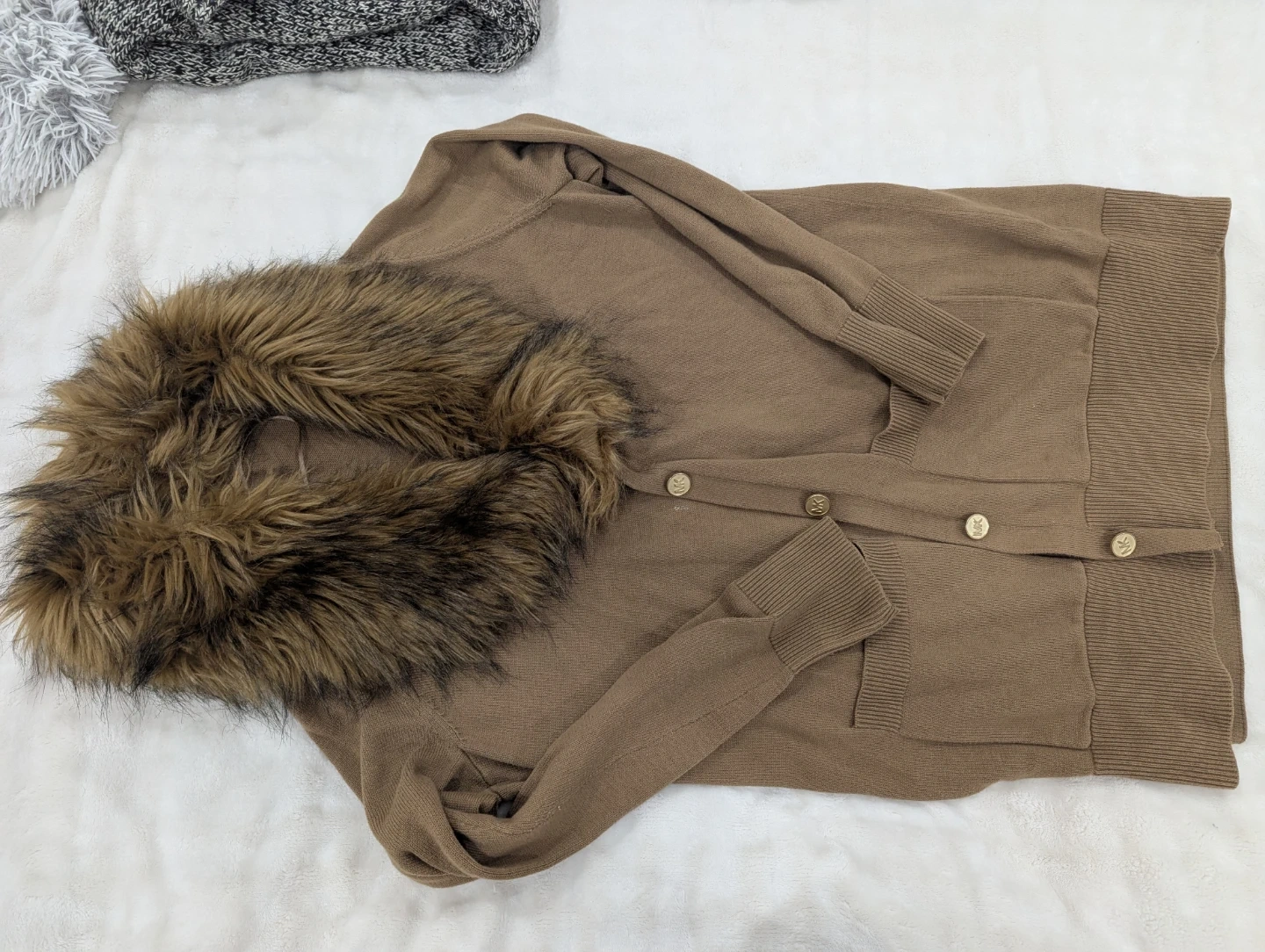 Selling a cozy tan cardigan featuring a stylish faux fur collar! It's in great condition and perfect for adding a touch of warmth and flair to any outfit Size L