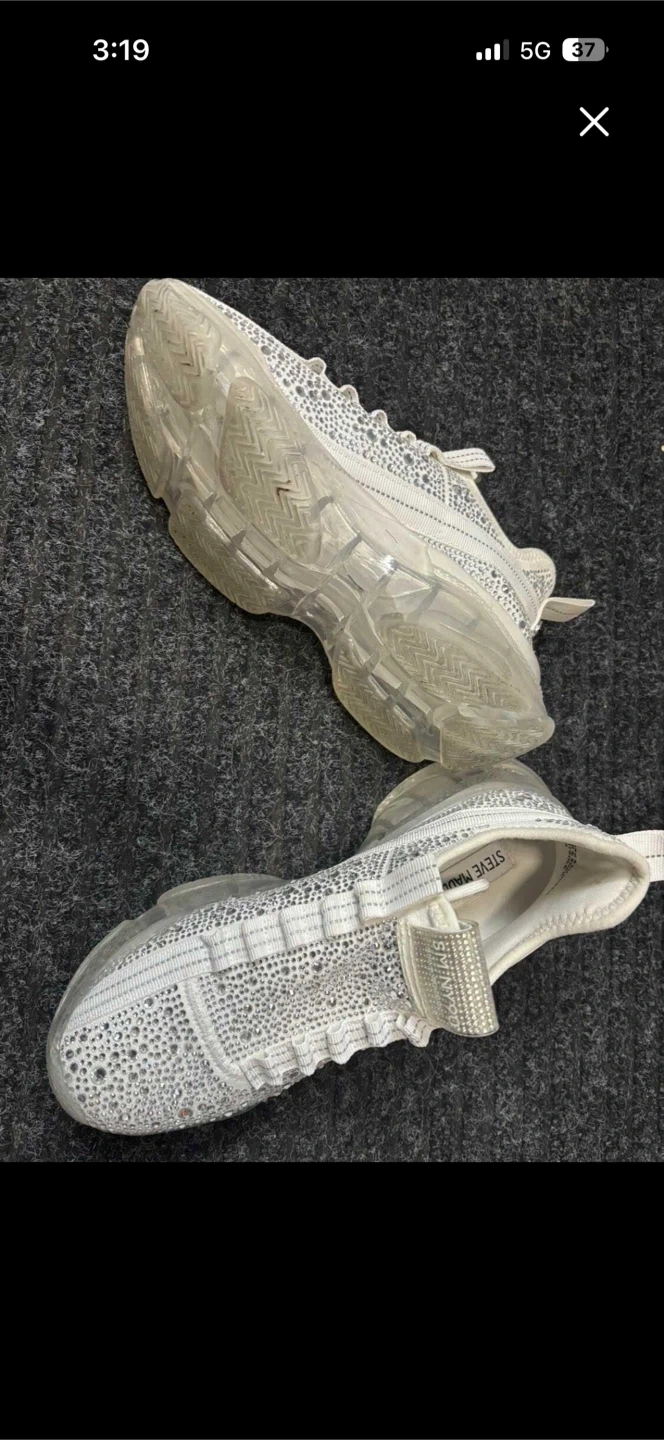 These dazzling Steve Madden slip-on sneakers are covered in sparkling rhinestones. They have a comfortable, cushioned sole and a stylish clear chunky heel. Perfect for adding some glam to your everyday look!