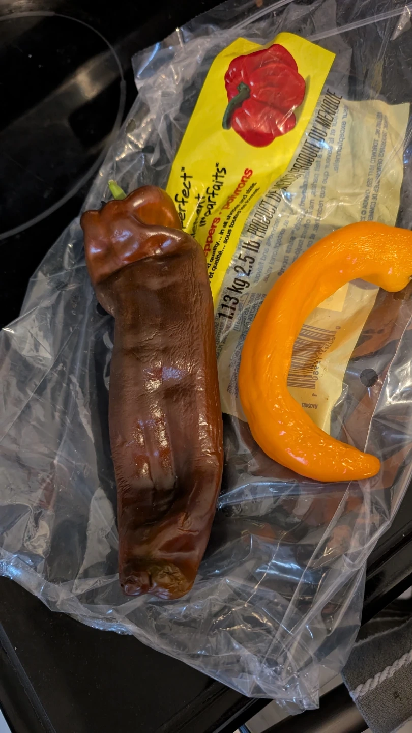 A little wrinkly but still good to use. Contains a dark brown pepper and an orange pepper. This is a product of Mexico.