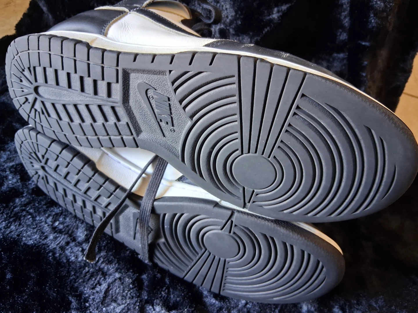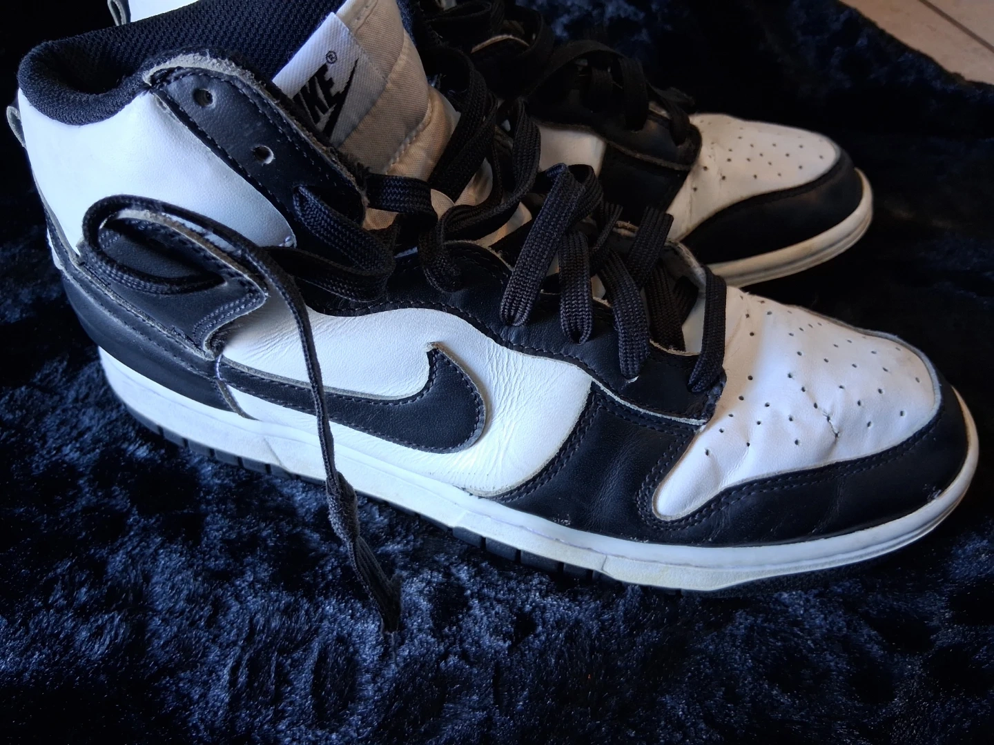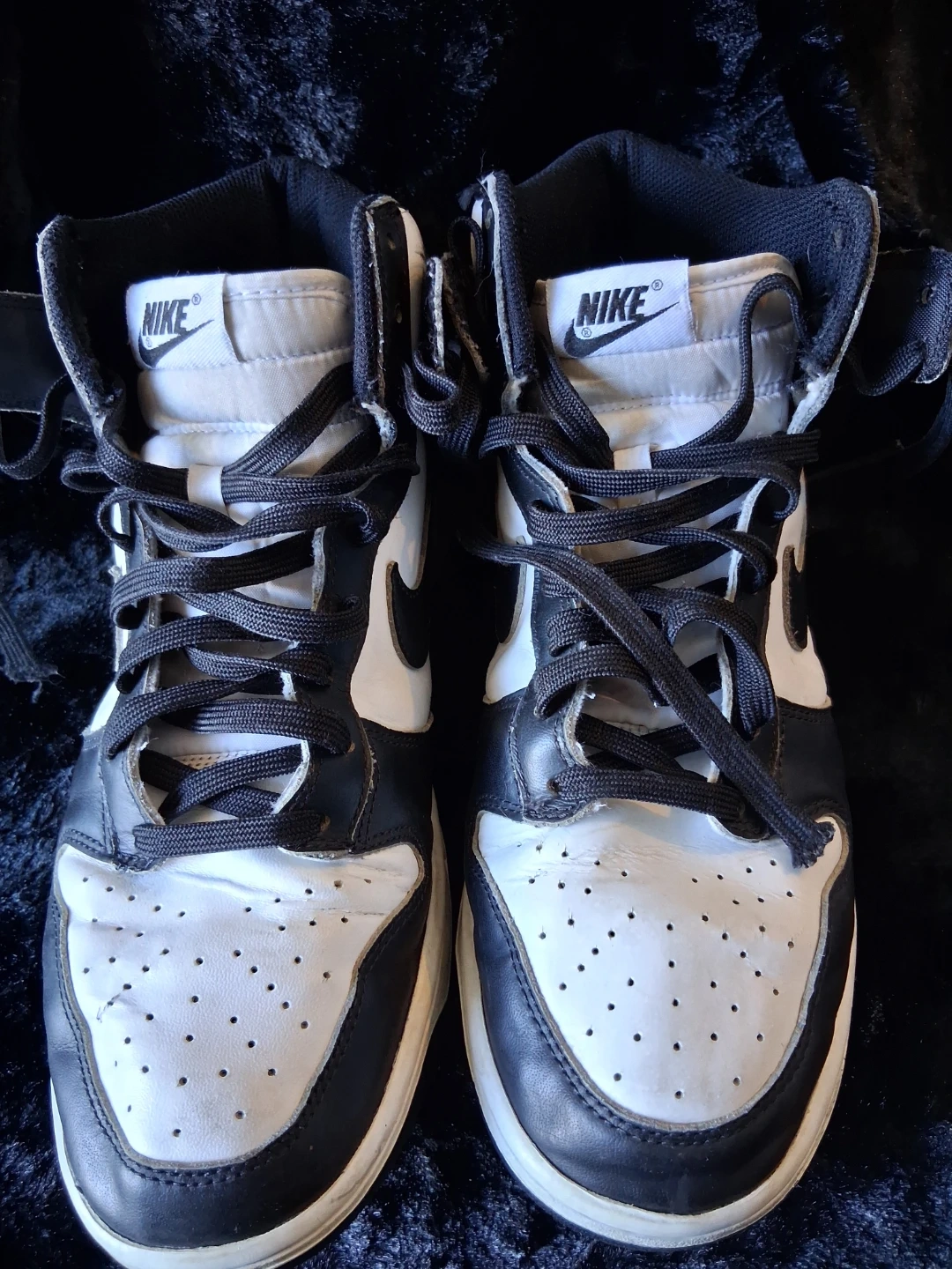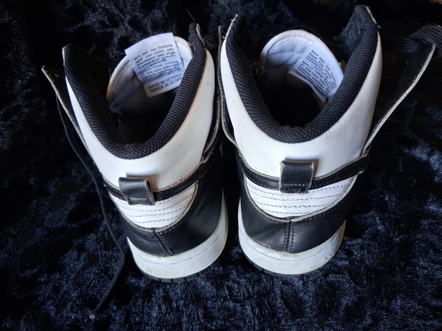 Classic black and white Nike Dunk High sneakers. Leather upper with perforated toe box. Rubber outsole with excellent tread. Made in Vietnam.