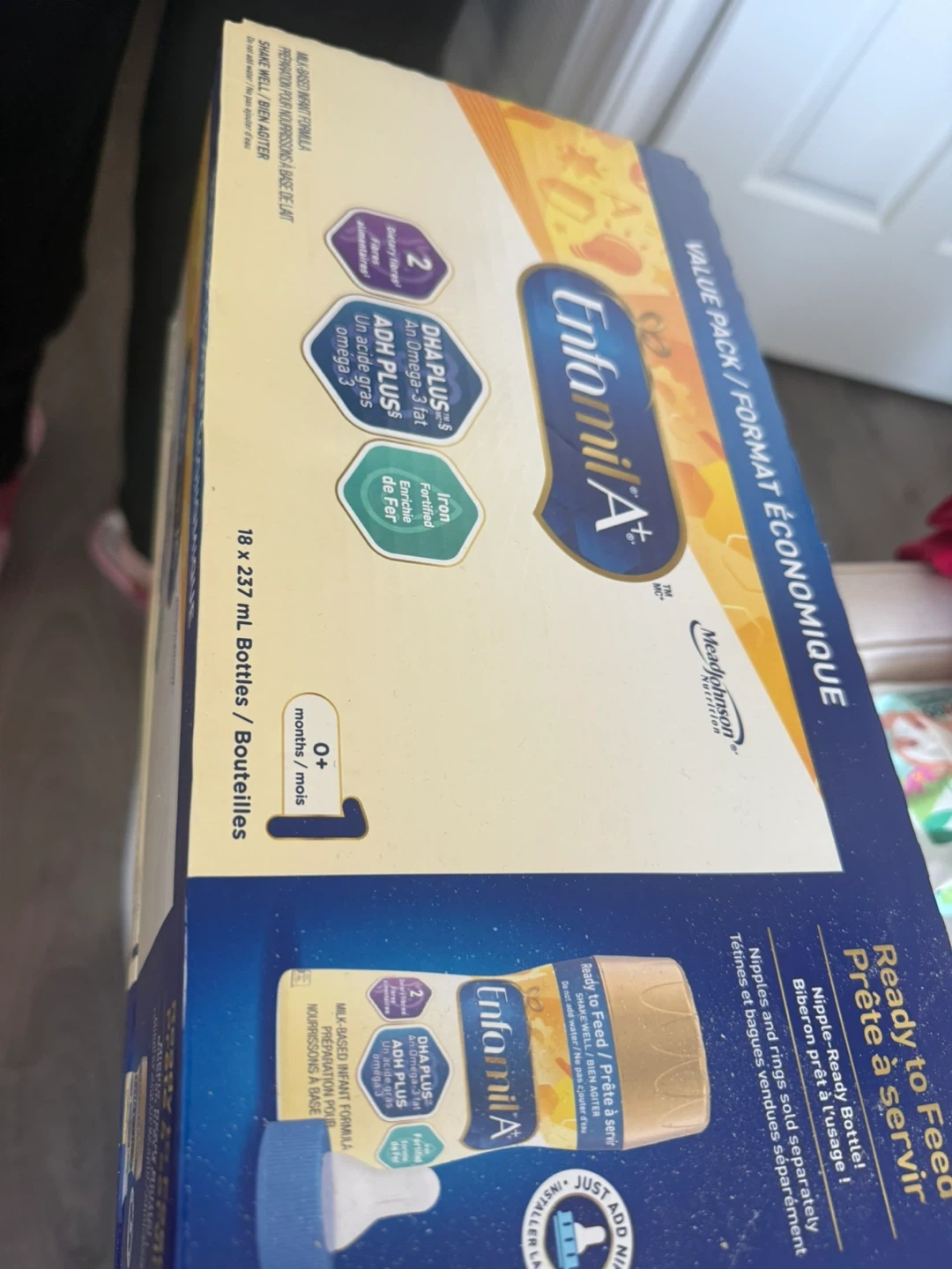 Value pack of Enfamil A+ ready-to-feed infant formula. Each bottle contains 237 mL and is suitable for 0+ months. It's DHA PLUS enriched with Omega-3 fat and fortified with iron.
