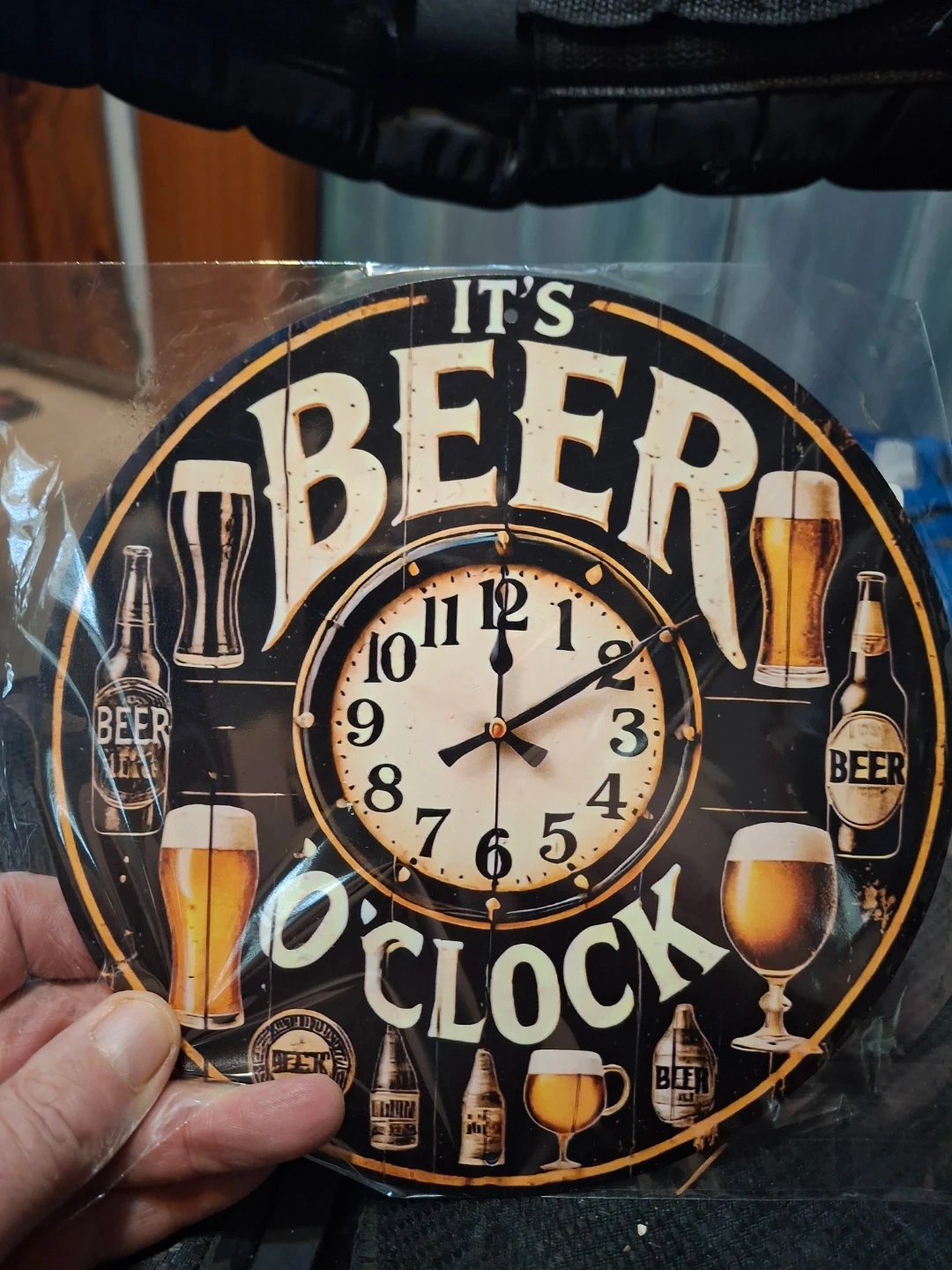 This is a decorative wall clock with a fun beer theme. It features a round design with various beer glasses and bottles depicted. It's a great conversation starter for any bar or rec room!