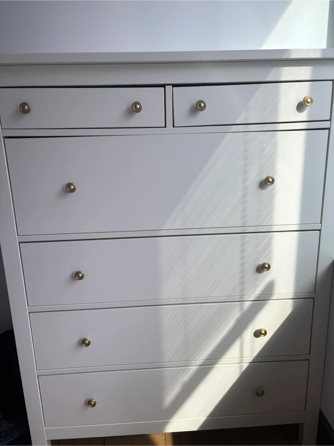 This white IKEA HEMNES dresser offers ample storage with its 6 drawers. It features a width of 108 cm and a height of 131 cm. The dresser comes with golden knobs for a classic look. It's in great condition, sturdy, and has very minor wear marks.