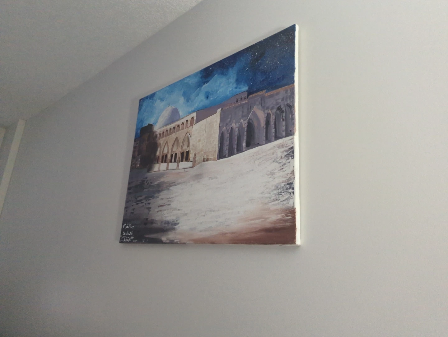 Acrylic painting depicting a mosque with a dome and arches under a starry night sky. The artwork showcases a blend of architectural detail and abstract background elements.