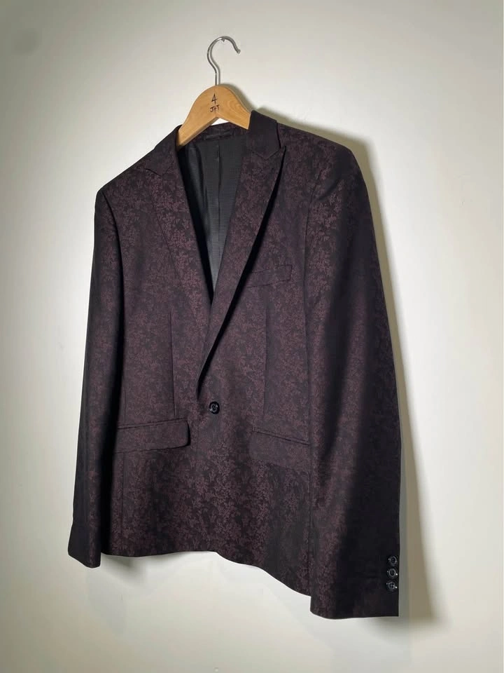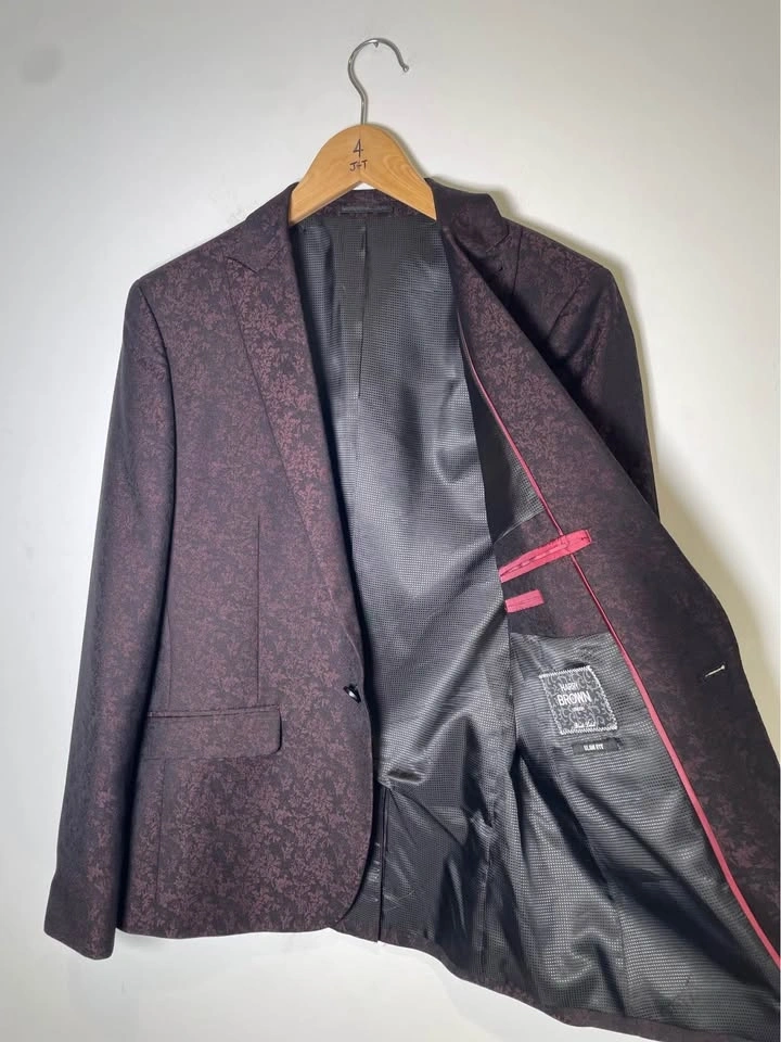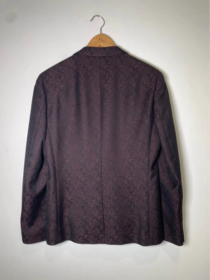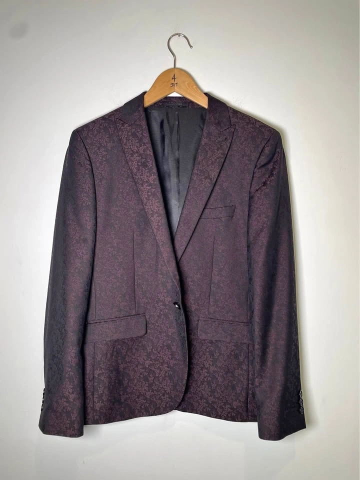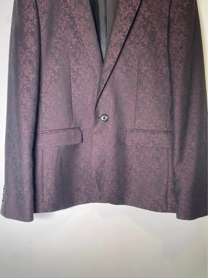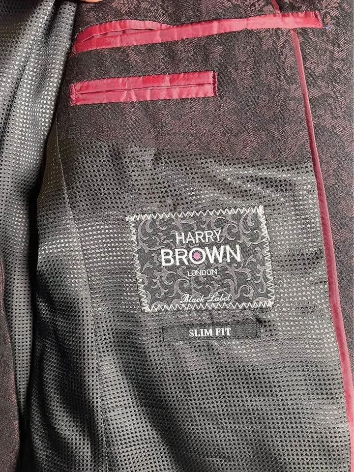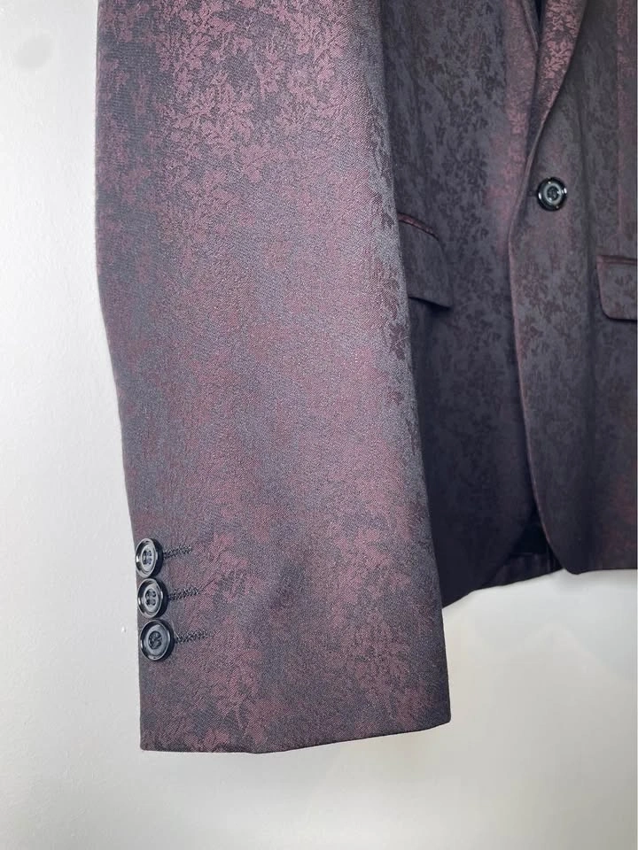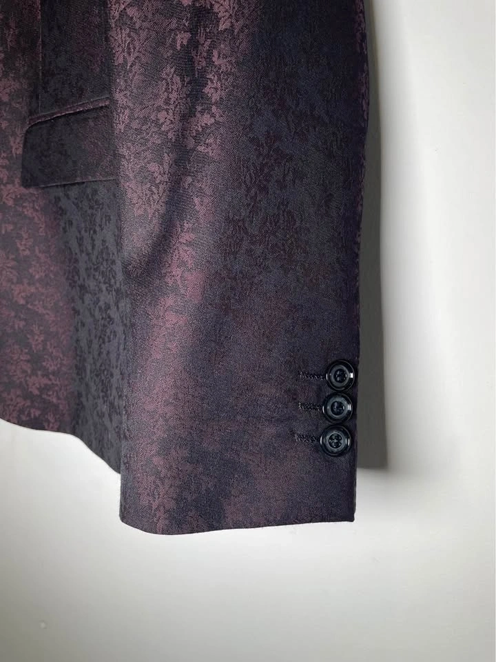 Standout floral brocade blazer from Harry Brown London. This jacket features a rich, deep burgundy color with a subtle botanical pattern and a sharp, one-button closure. It’s a great piece for a formal event, stage wear, or anyone looking for a tailored "rock star" aesthetic.