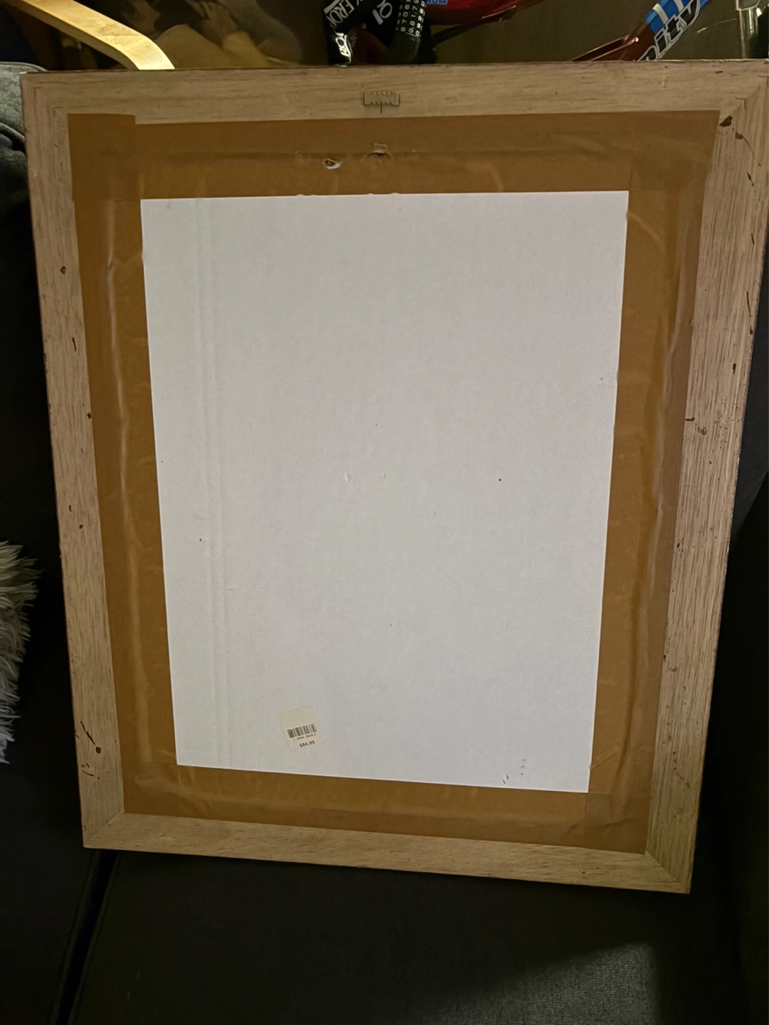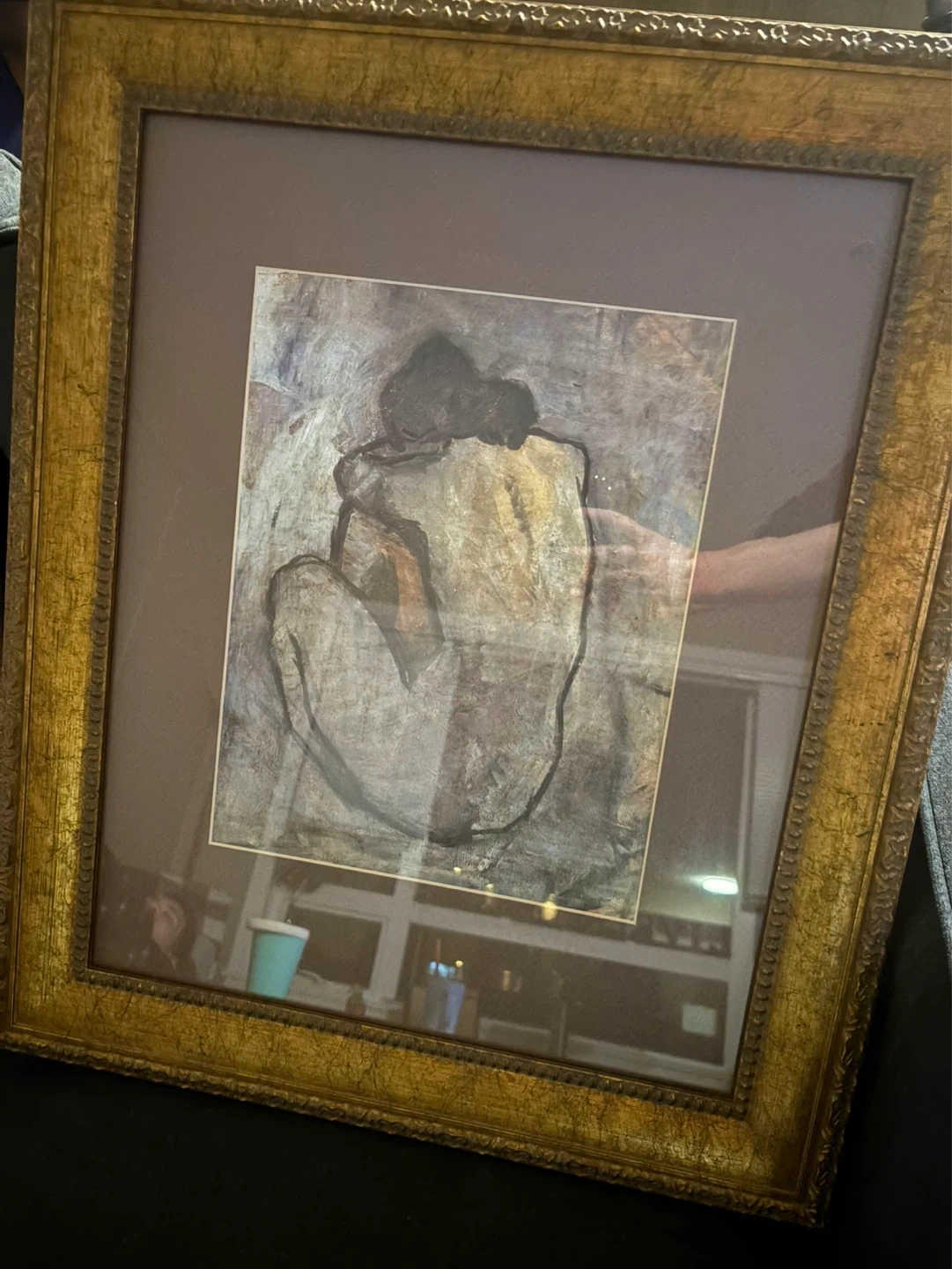 This framed artwork depicts an abstract study of a figure. The piece is set in a gold-toned wooden frame. It's ready to hang and would complement various decor styles.