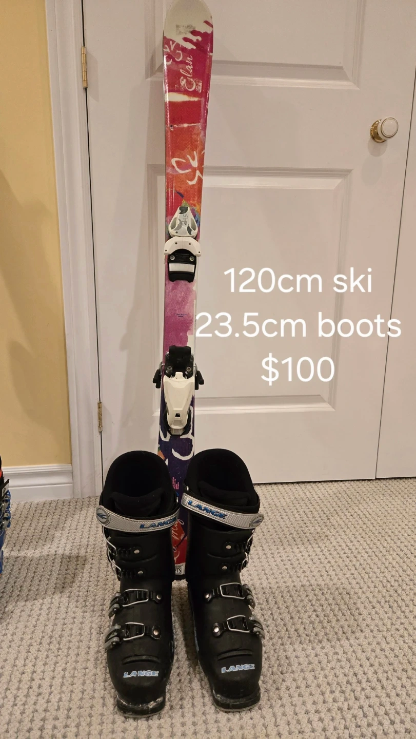10Selling a pair of skis and ski boots! The skis are Elan brand and measure 120cm. The boots are Lange and are size 23.5cm.