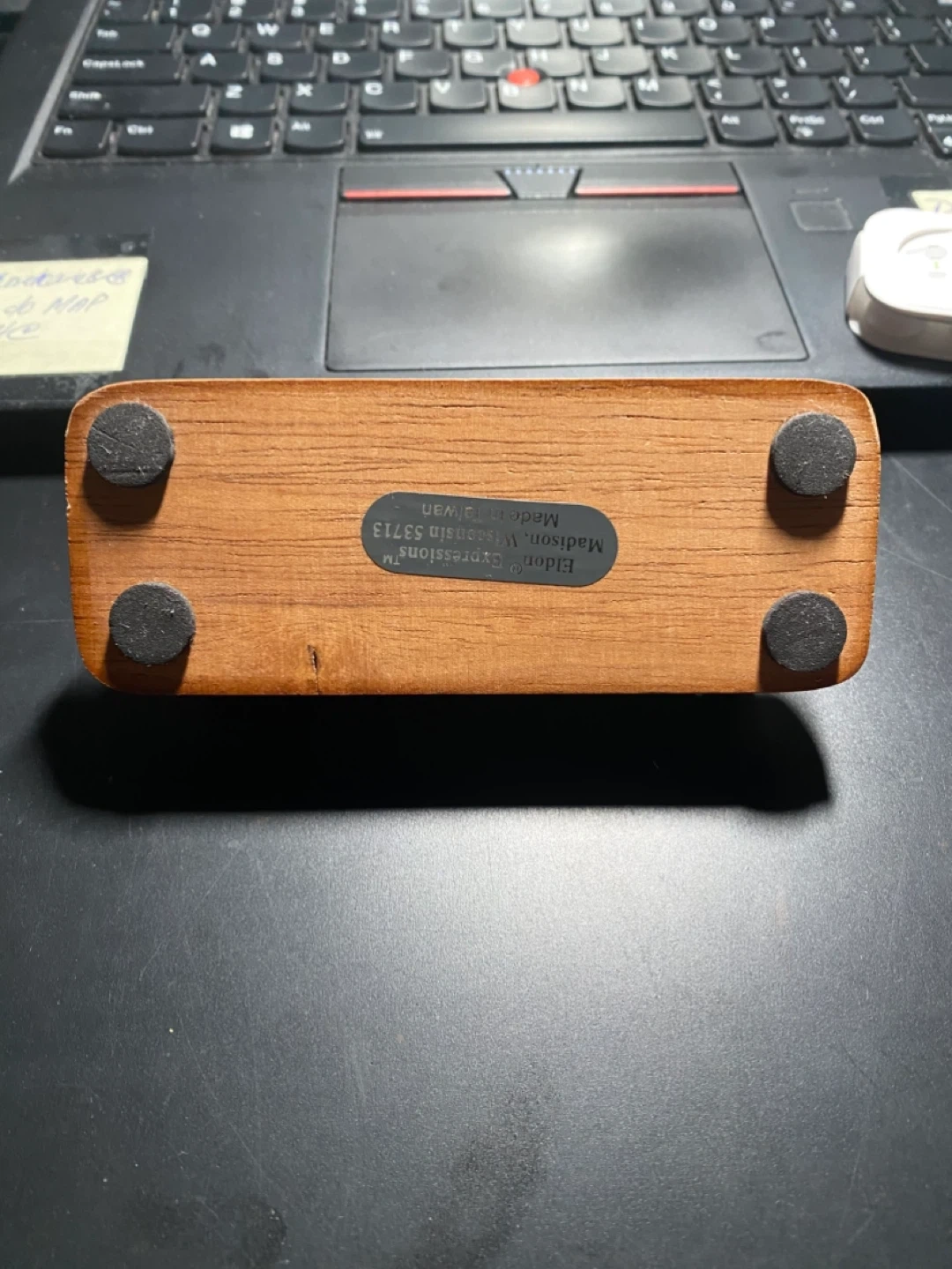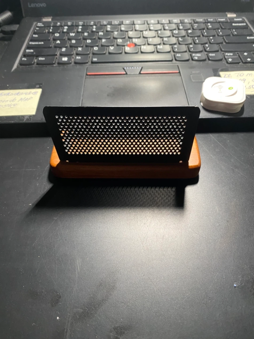 185Here's a business card holder by Eldon Expressions. It features a wooden base and a black metal mesh card holder. It's in great condition and ready for a new home!