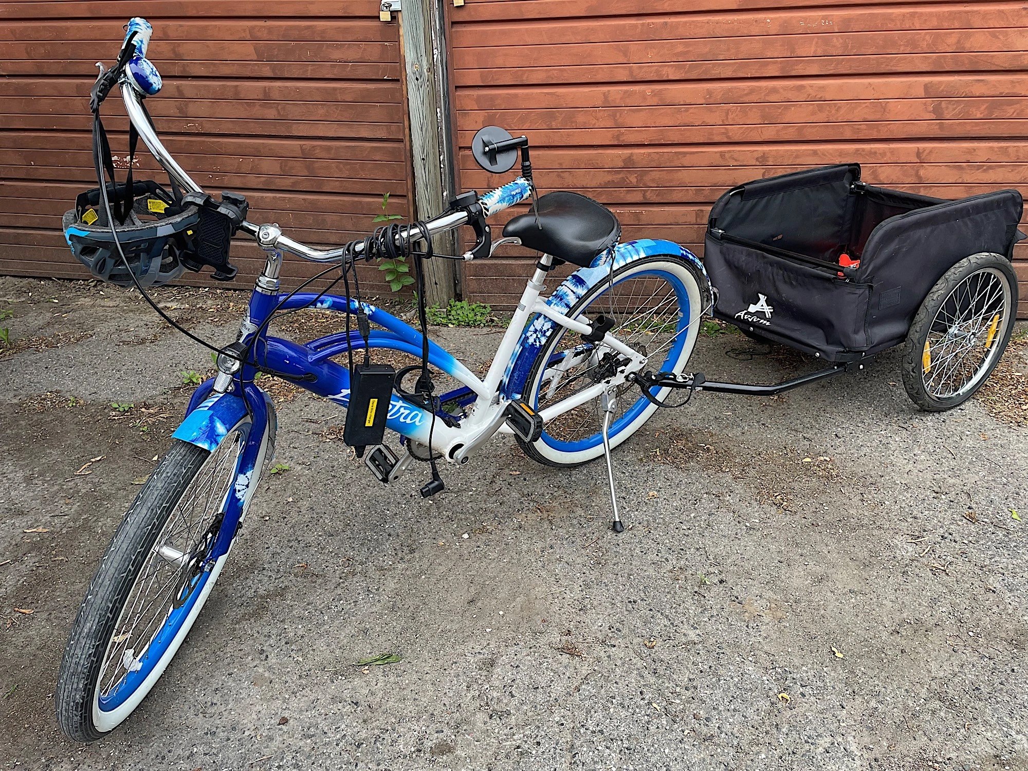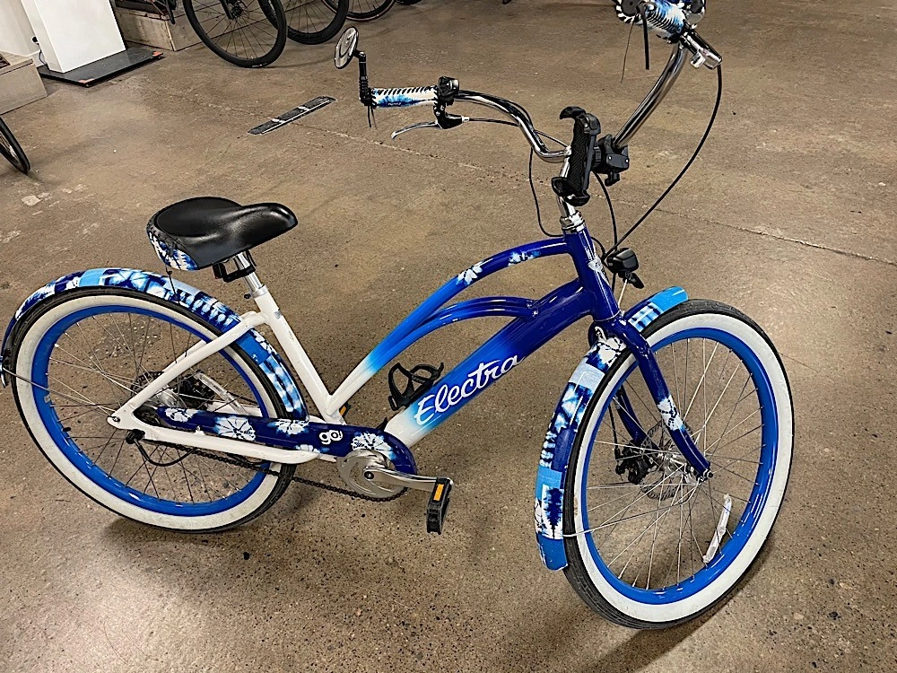 0am the original owner and paid $2500.00 before all the add ons. The bike comes with a detachable trailer, mirror, water bottle holder, phone holder. Here is more information about the bike: Don't let the name Cruiser fool you, we took the bike that started it all and kicked it up a notch with a rear hub motor featuring three levels of support. Even as a single speed, the Electra E-bike System tackles pesky hills and longer rides. Mechanical disc brakes provide powerful stopping while 26" tires ensure a smooth ride to the beach and back. Custom fenders, saddle and grips, and matching bell make this one fun, stylish ride. Why you'll love it 1. Comfortable cruising comes standard with Electra's Flat Foot Technology®. Class 1 electric bike with a pedal-assisted speed up to 20 mph. 2. Up to a 40-mile range on a single charge. 3. 250Wh rear hub motor delivers 40Nm of torque. 4. Custom embossed saddle, grips and matching bell make this e-bike as unique as you. 5. The artwork on this bike is authentic Shibori dyes created by one of our designers.