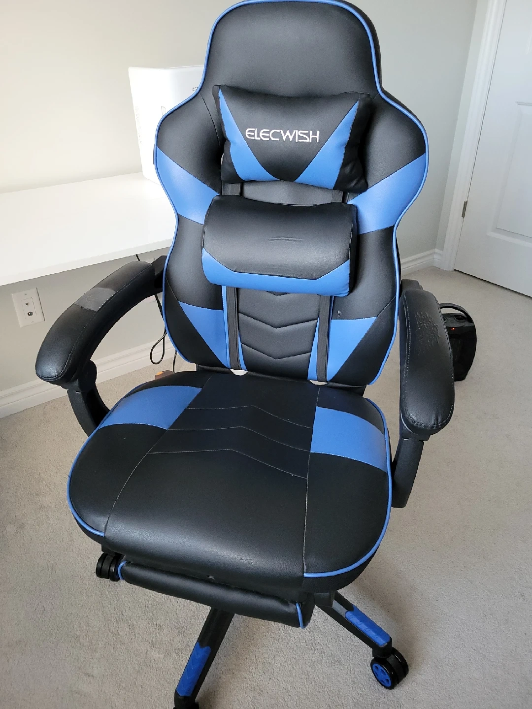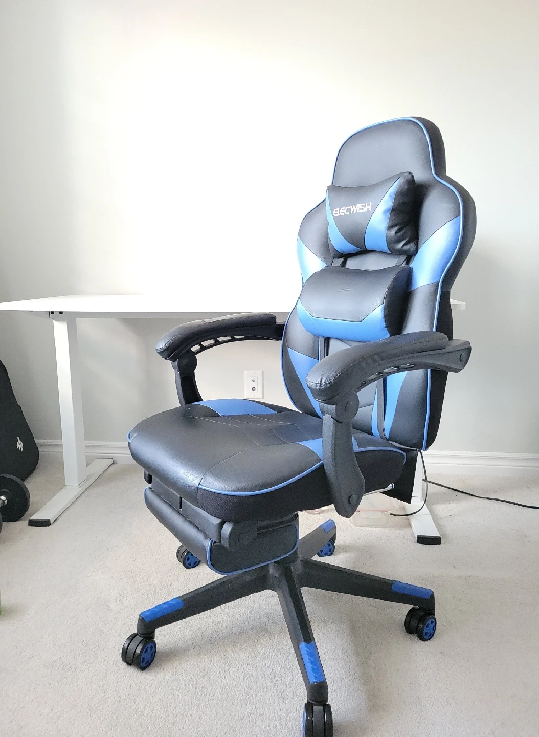 65DESK DESCRIPTION: Electric Adjustable Desk:Height of the electric standing desk with premium single motor can be adjusted from from 28.3" to 47.4", at a speed of 1"/second with low noise while running. It is a perfect choice for you study or working by setting the 4 different heights. Large Workspace:The electric standing desk comes with a spacious two-piece tabletop measuring 55” x 23.6”,smooth and anti-scratch, which provies a large space for your monitors,laptops,office files or printer. 2 cable management holes on the desk, help keep the desk panel neat and tidy. Durable&Sturdy Construction:The adjustable standing desk is made of two-piece high quality solid particle board with smooth edge and enhanced heavy duty metal frame, offerring strong support up to 177.7lbs and ensuring better stability and sturdiness. The 4 footpads can be adjusted from 1 to 3cm, help keep the sit stand desk stable on uneven floor. CHAIR 💺DESCRIPTION : LARGE SIZE ergonomic video game computer racing chair with retractable footrest, weight capacity is 330lbs, suitable for women and men COMFORTABLE soft PU Leather and thicken widen seat/ Relax your hand by the streamline ergonomic paralleled adjustable armrest/Rest yourself by tilting the back, 0--170 degrees, enjoy a snap sleep Non-slip smooth rolling caster wheels, anti-scratch and protect the floor