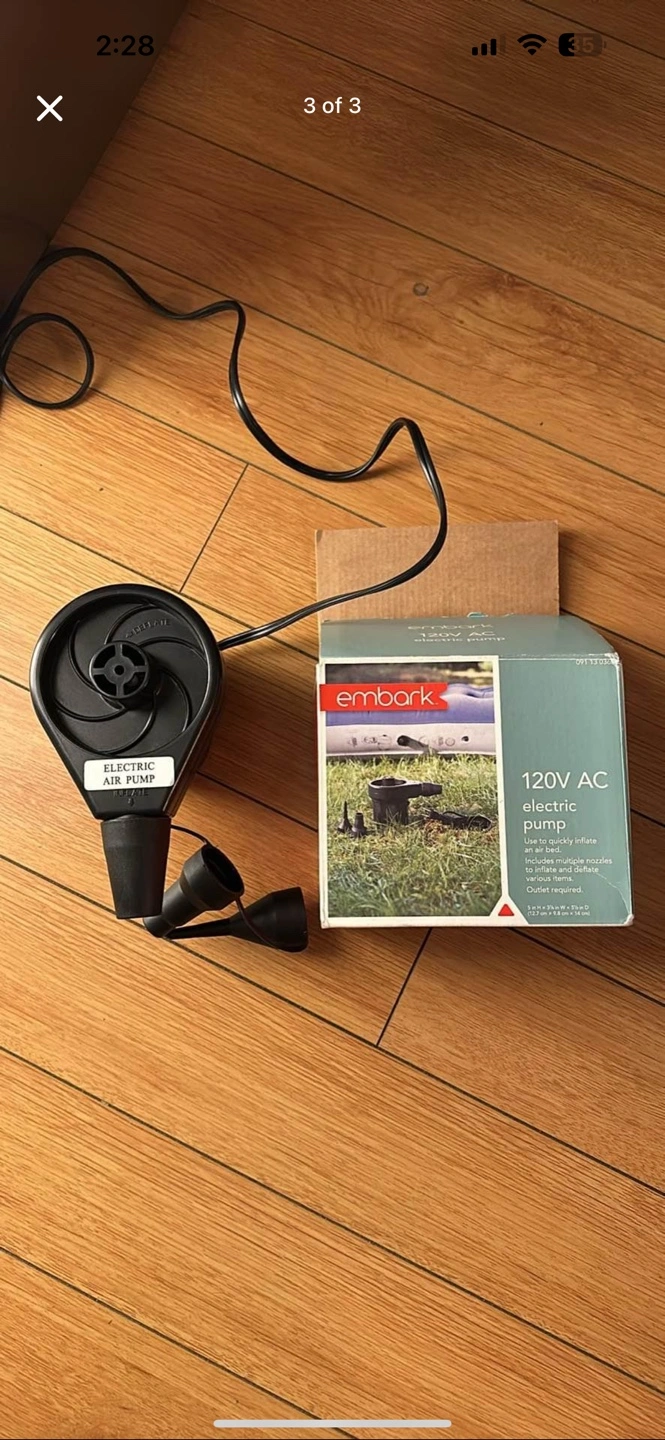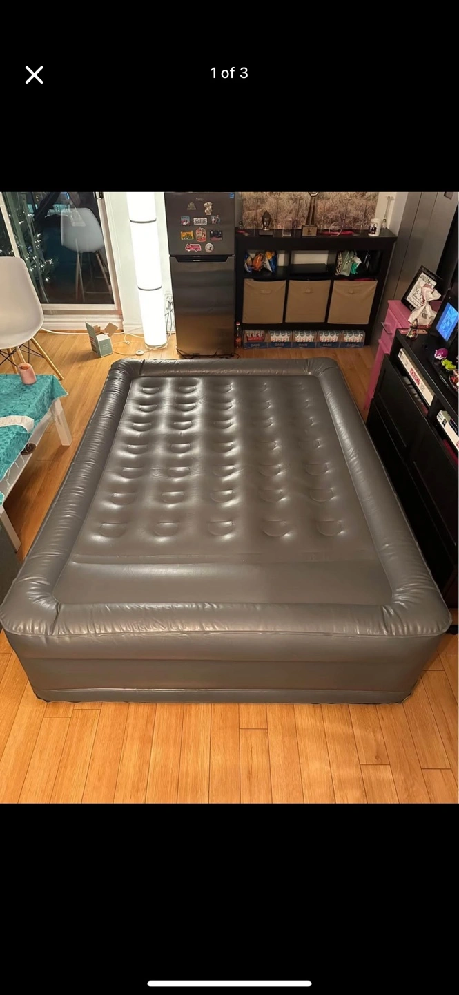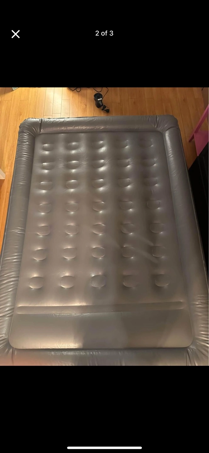 216Grey inflatable mattress. Includes electric air pump. 120V AC. Great for guests.