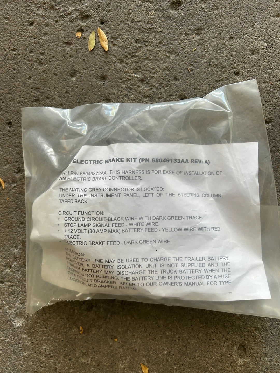 Selling an electric brake kit, part number 68049133AA. This harness is for easy installation of an electric brake controller. It includes wires for ground circuit, stop lamp signal feed, and 12 volt battery feed. The mating grey connector is located under the instrument panel, left of the steering column, taped back , brand new in wrap , pls text 4164027666