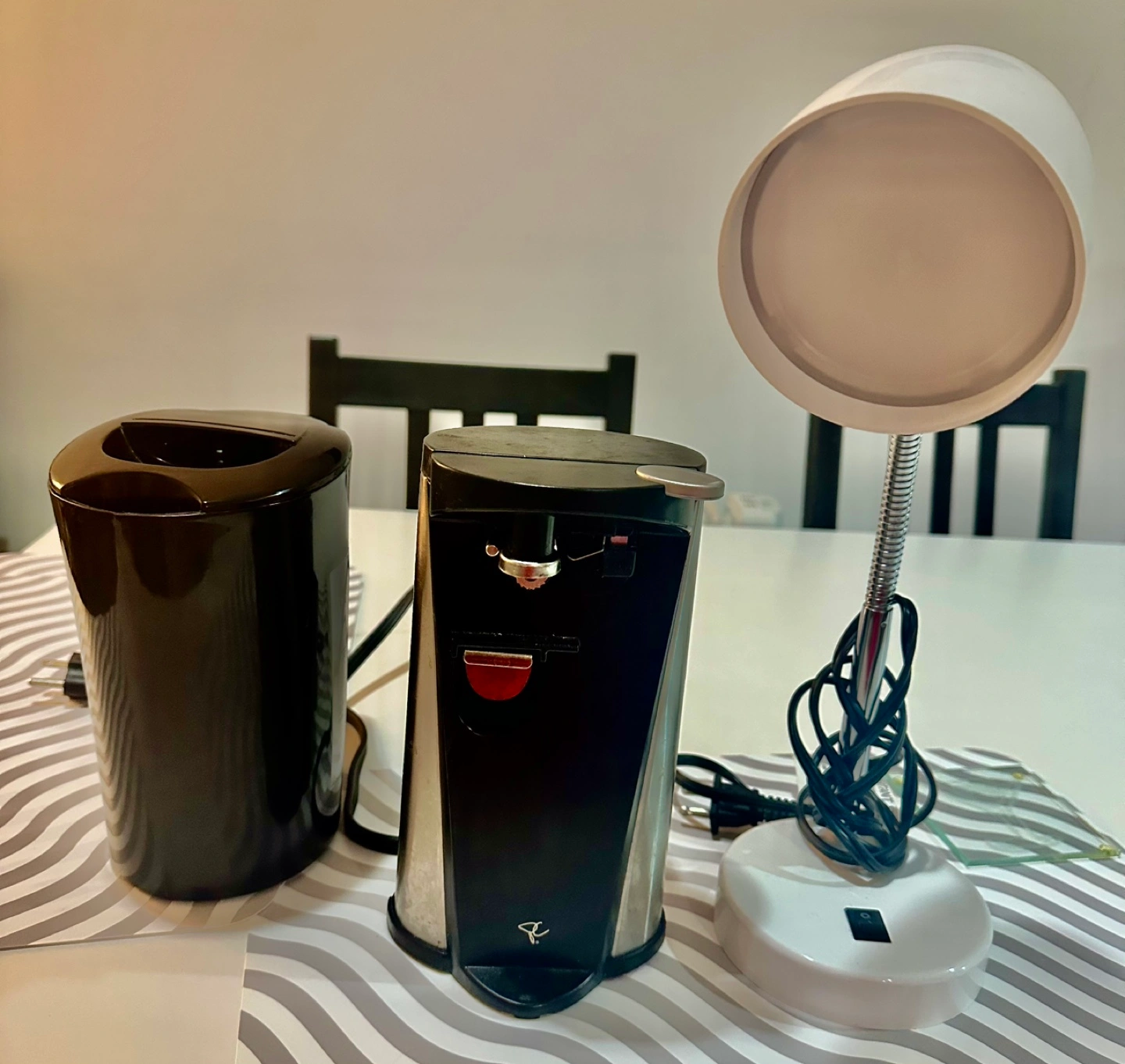 Set includes an electric can opener, a small flexible neck desk lamp, and a black electric kettle. All are in used condition. Great for a small apartment or dorm room.