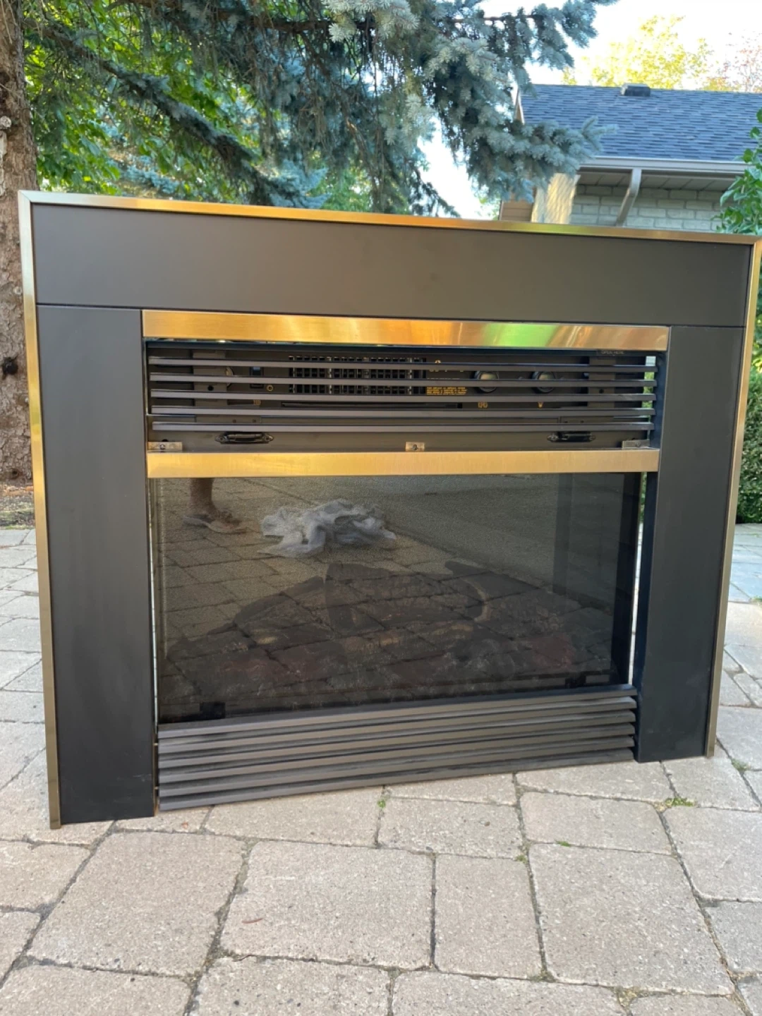 Selling an electric fireplace insert with a sleek black finish and elegant gold trim. It's in great shape and ready to add some warmth and ambiance to your space. Perfect for creating a cozy atmosphere on those chilly evenings!