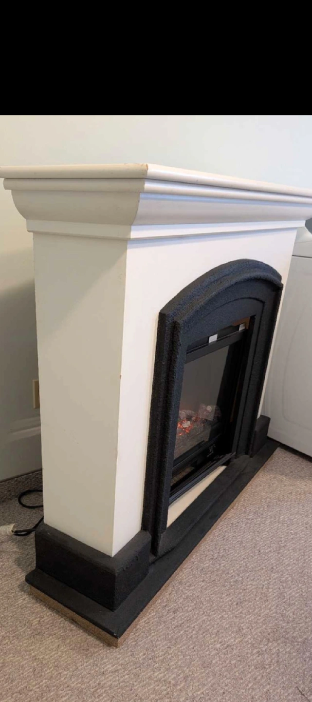 98Reduced to Sell The first $260 Selling an electric fireplace with a white mantel and black firebox surround. Please Note: Mantle needs to be cut about 2 inches on each side to fit firebox.. great condition and provides a cozy ambiance. Perfect for adding warmth to any room!