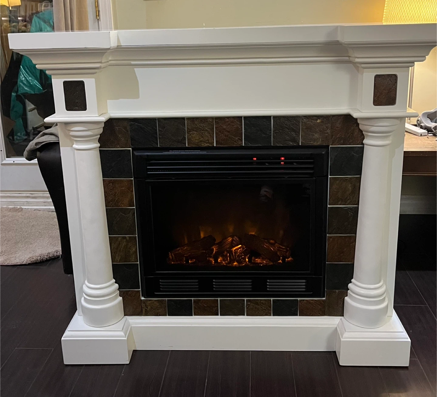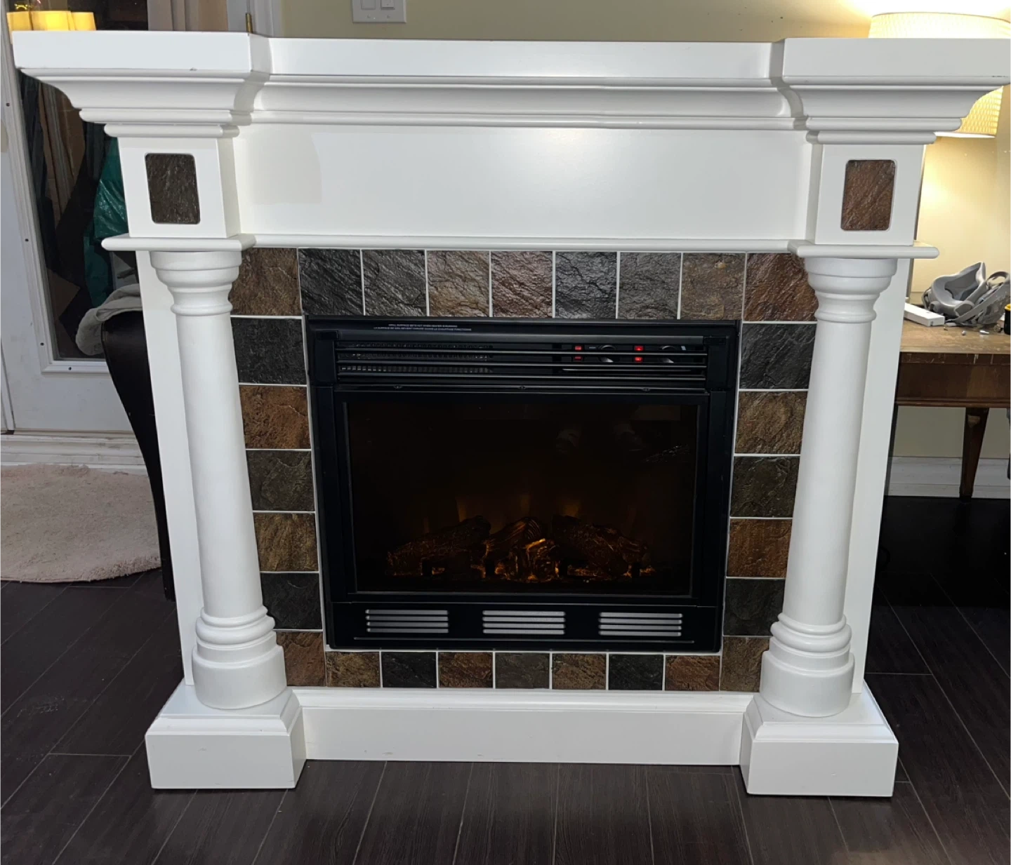 143Selling an electric fireplace in great condition! It has a classic white mantel with decorative columns and a faux stone tile surround. There’s also a corner piece in the back that you can set up so it lines up with the walls in any positions; straight, or angled. The fireplace comes with a remote control for easy operation. Perfect for adding warmth and ambiance to any room in your home and can be used as a tv stand/decorative table as well. Dimensions: 44.5” (L) x 16” (W) x 40” (H) Price negotiable Pickup only and yes it can be disassembled for easier loading