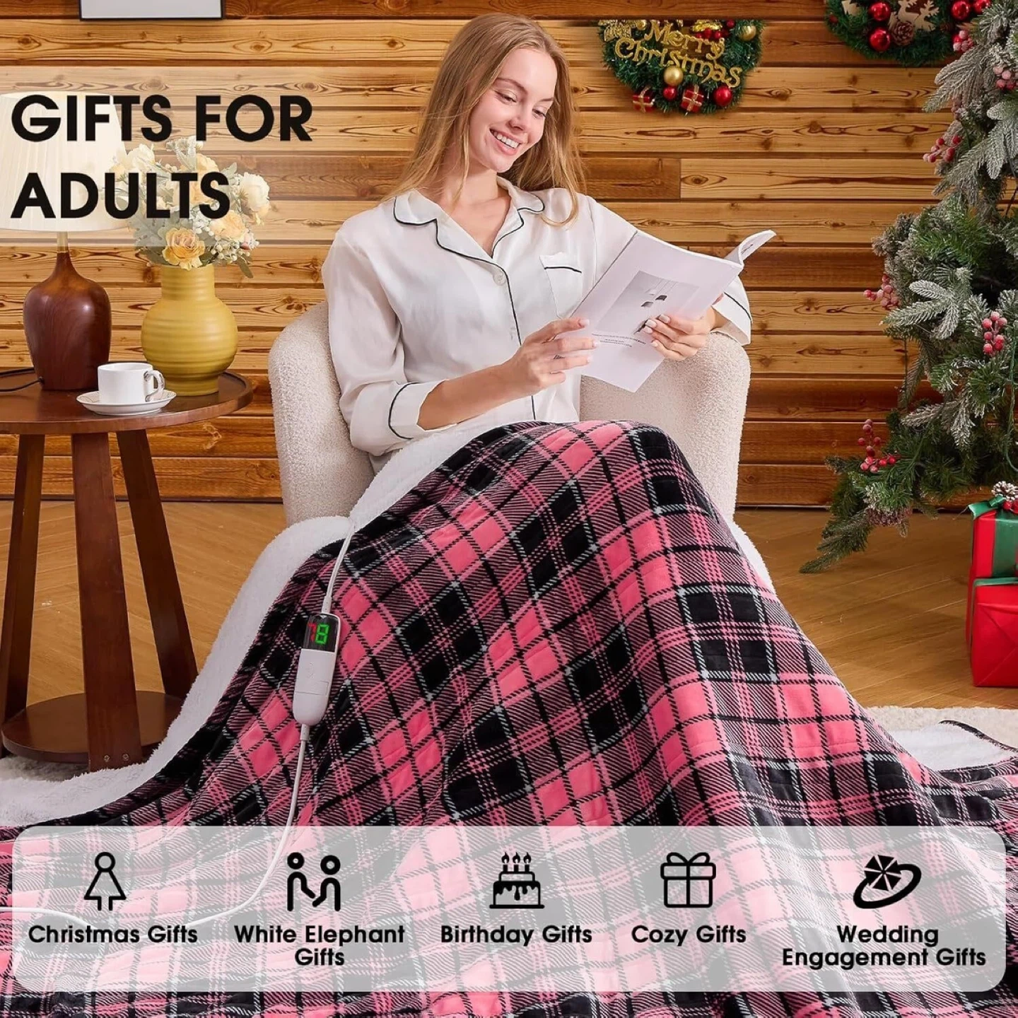 77Stay cozy with this electric heated blanket! It features a multifunctional controller with a single button, 4 time settings, and 6 heating levels. The blanket has evenly distributed heating wires for super warm and fast heating. It measures 50x60 inches and has a pink and black plaid pattern