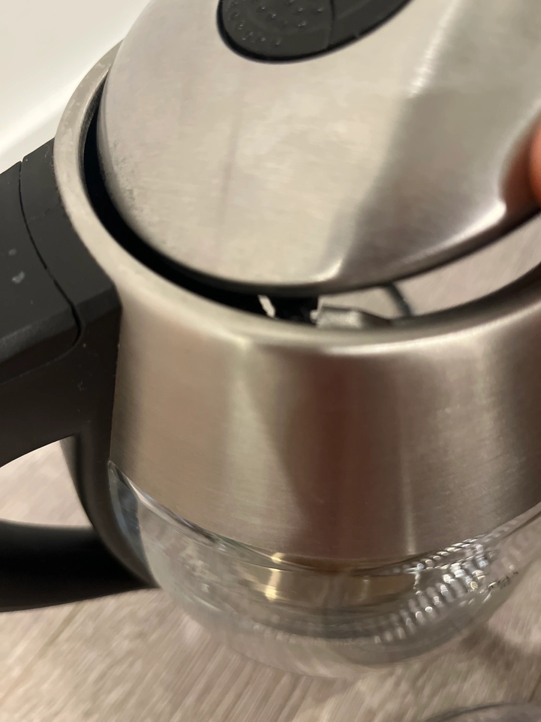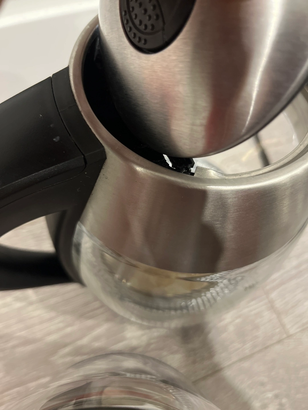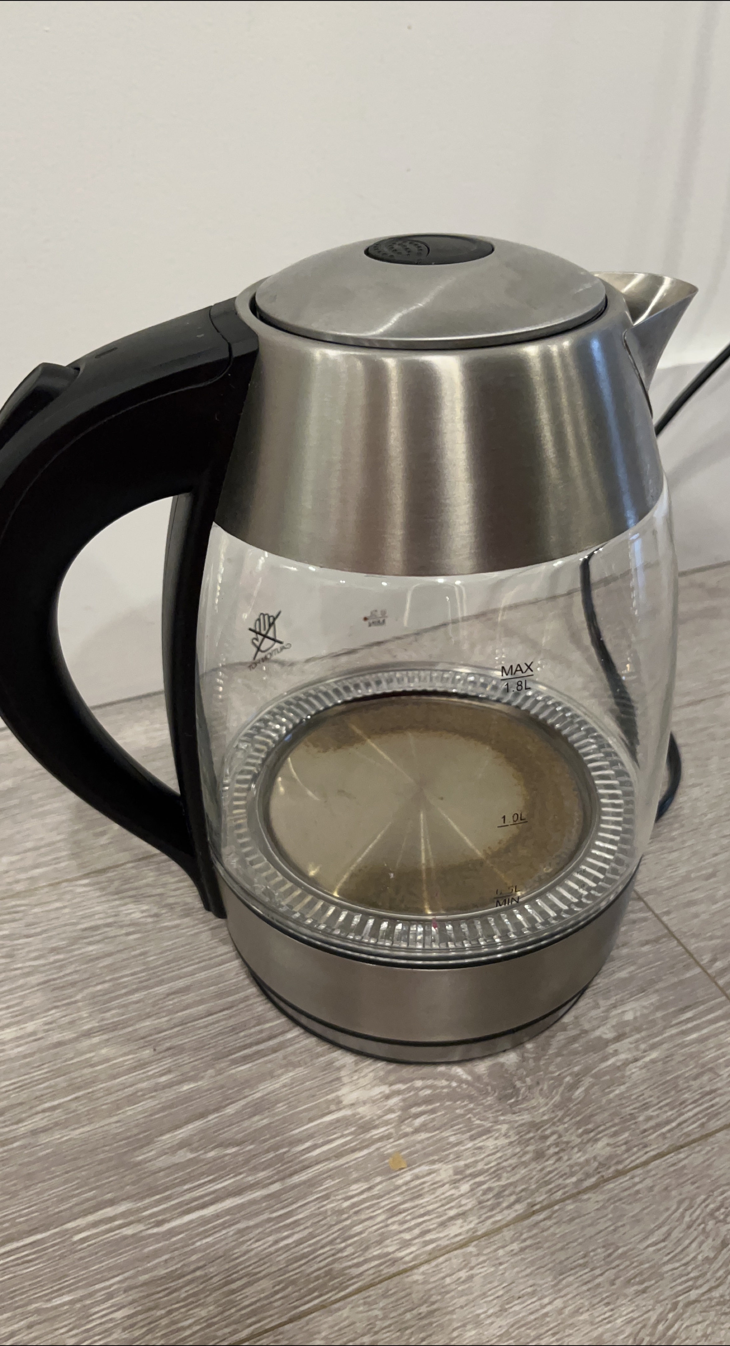 21[[ Priced to sell ]] Selling a used electric kettle with a 1.8L capacity. It has a clear glass body and a stainless steel/black finish. It has a crack on the lid (See pictures) . Otherwise, It's in good working condition (Boils water) but you need to manually shut it off. Due to crack on the lid Automatic shut off doesn’t work anymore I think... comes with the Tea Infuser attachment as shown in last Picture. Priced to sell. New one retails around $50.