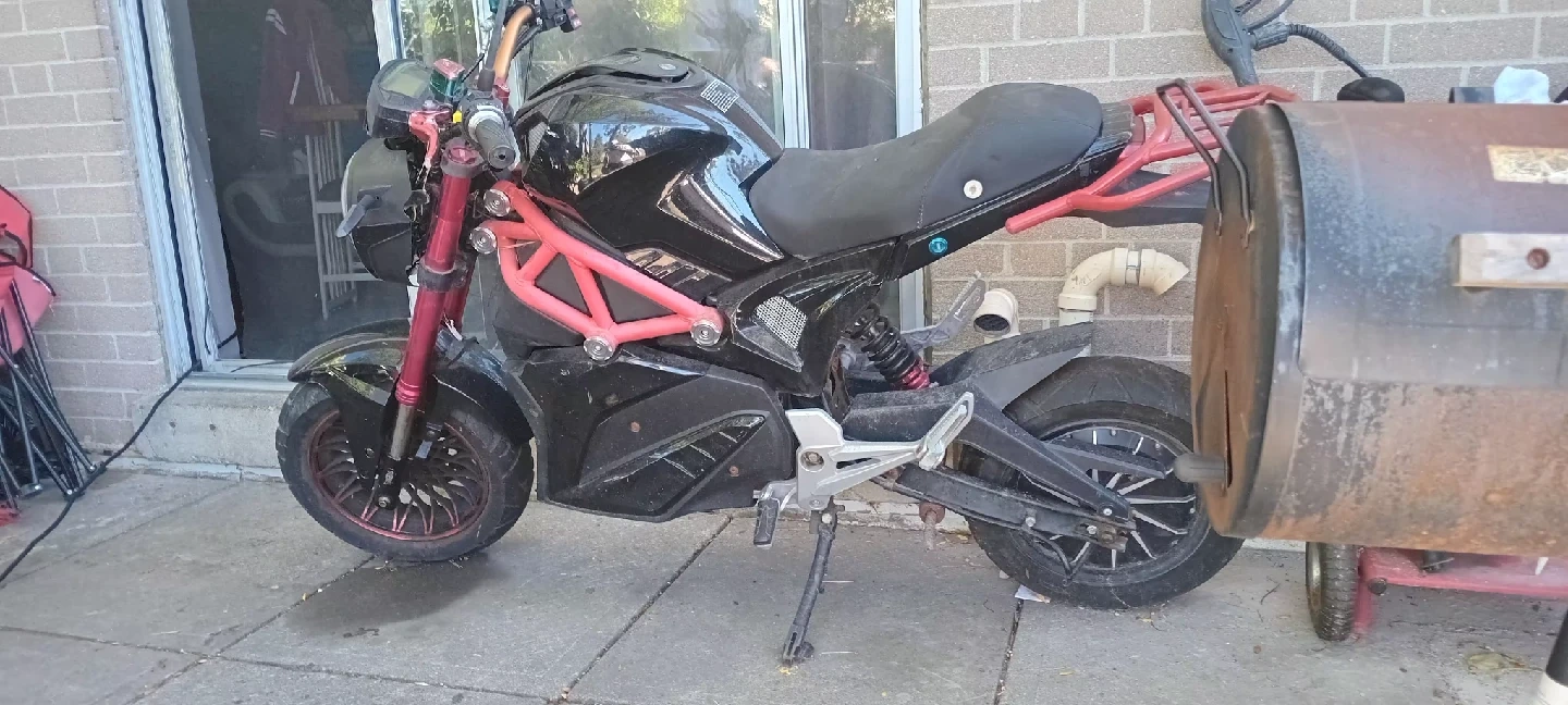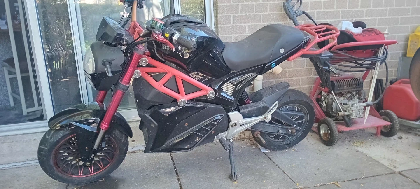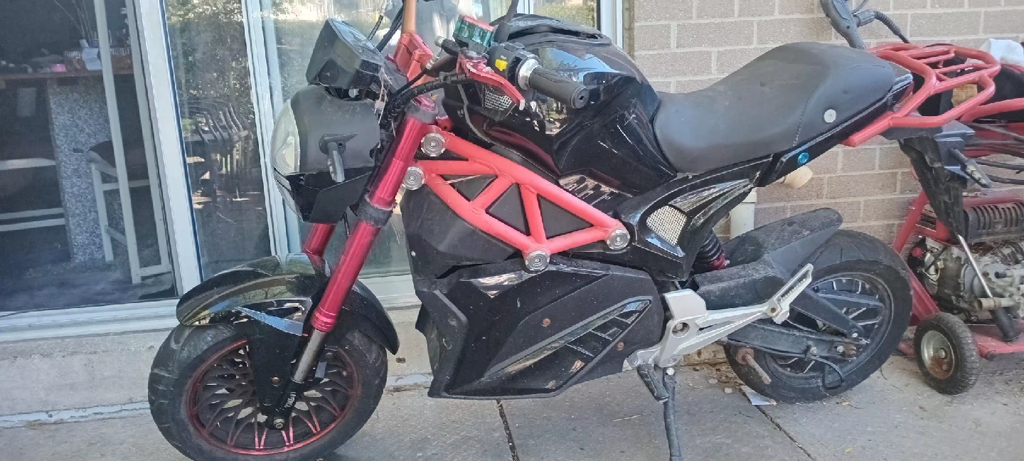10Selling an electric motorcycle in black and red. It's in used condition and ready for a new owner. Great for getting around town! the one with red 600$ pick up no battery frame lightly used go for project top speed was 90mph Black bike willing to take trade if offer is good bike has no battery but is set up as plug and play 250$ or iphone or android god trade 60mph with new daymac Bluetooth controller