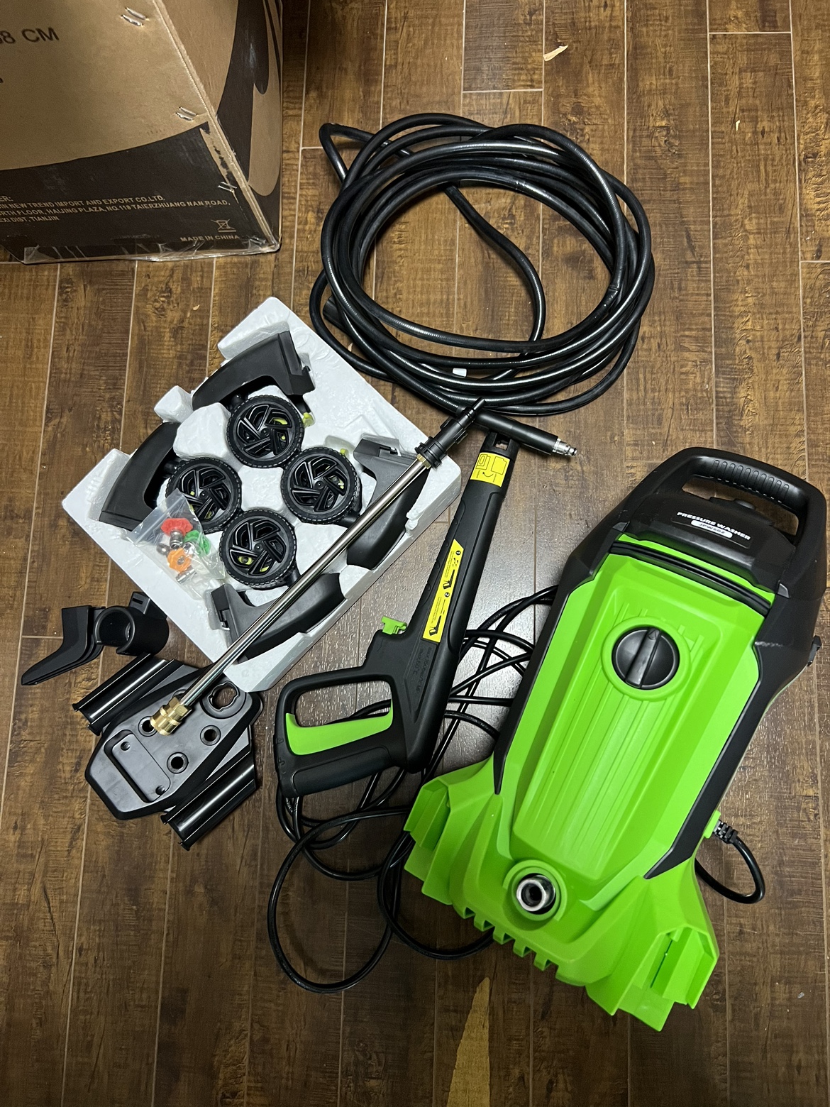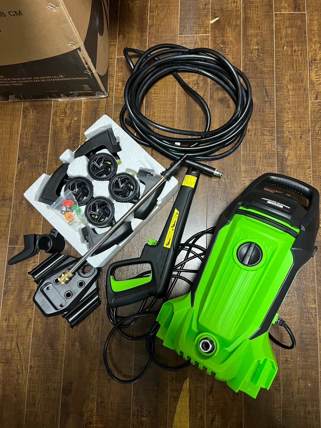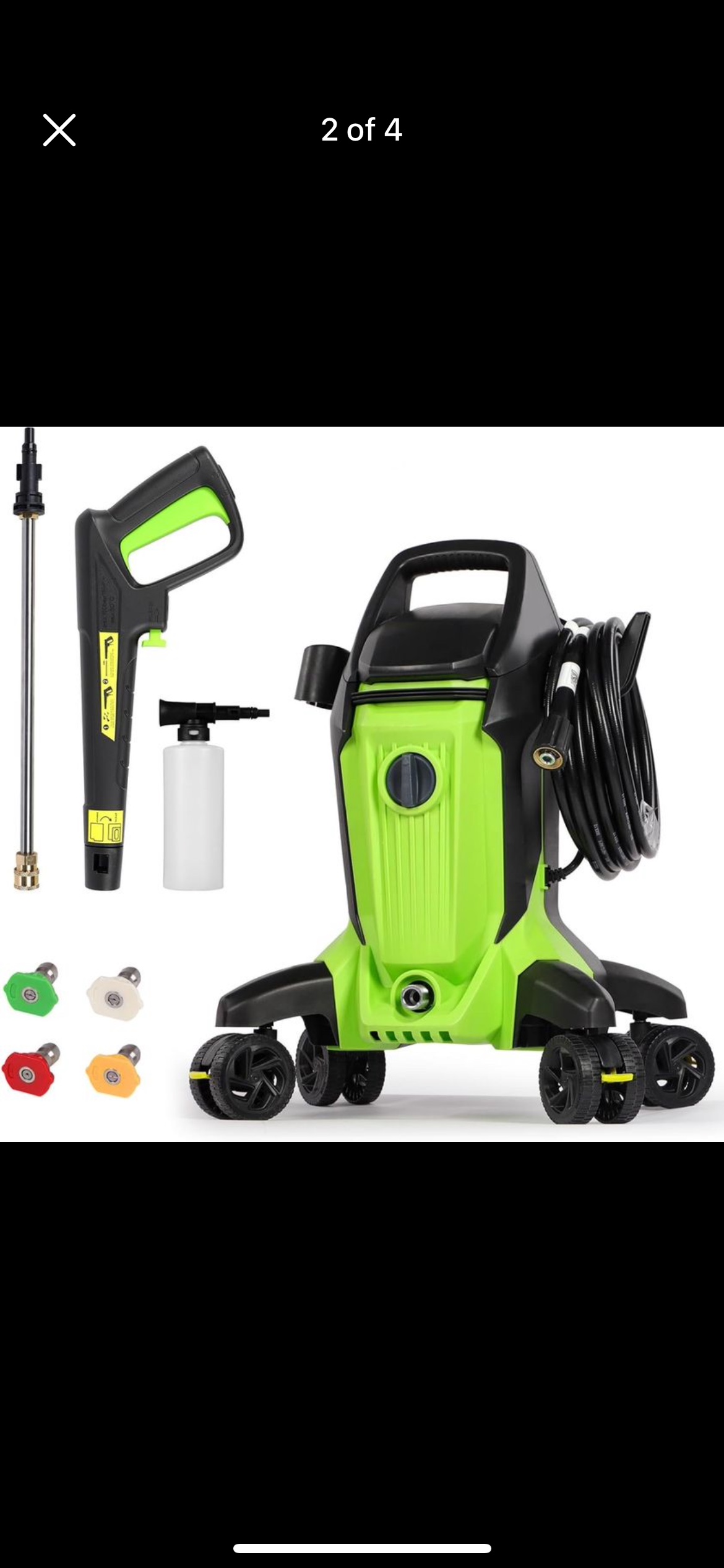 17Comes with wand, nozzle, and a variety of spray tips. Includes a hose and wheels for mobility. Brand new one