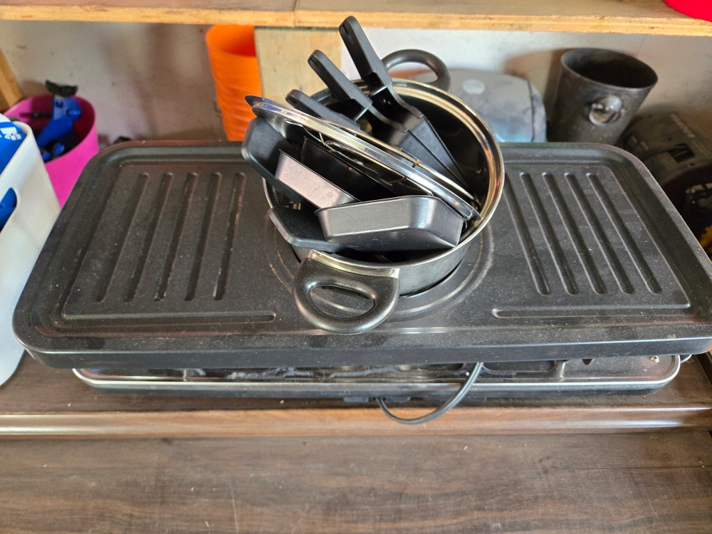Selling an electric raclette grill, complete with individual pans for melting cheese and grilling on top. It's perfect for a fun and interactive dinner party with friends and family! It includes all the components you need to get started.