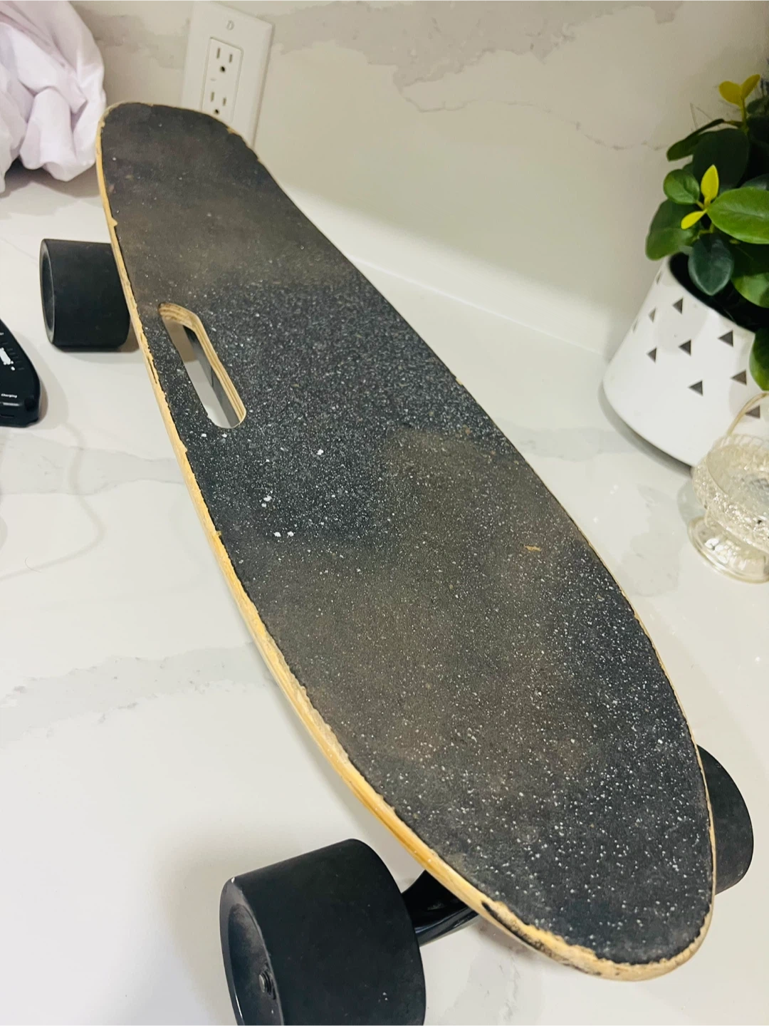 Selling an electric skateboard that's ready to ride! It comes with a remote control and charger so you can get started right away. It's in good condition and perfect for cruising around the neighbourhood or campus