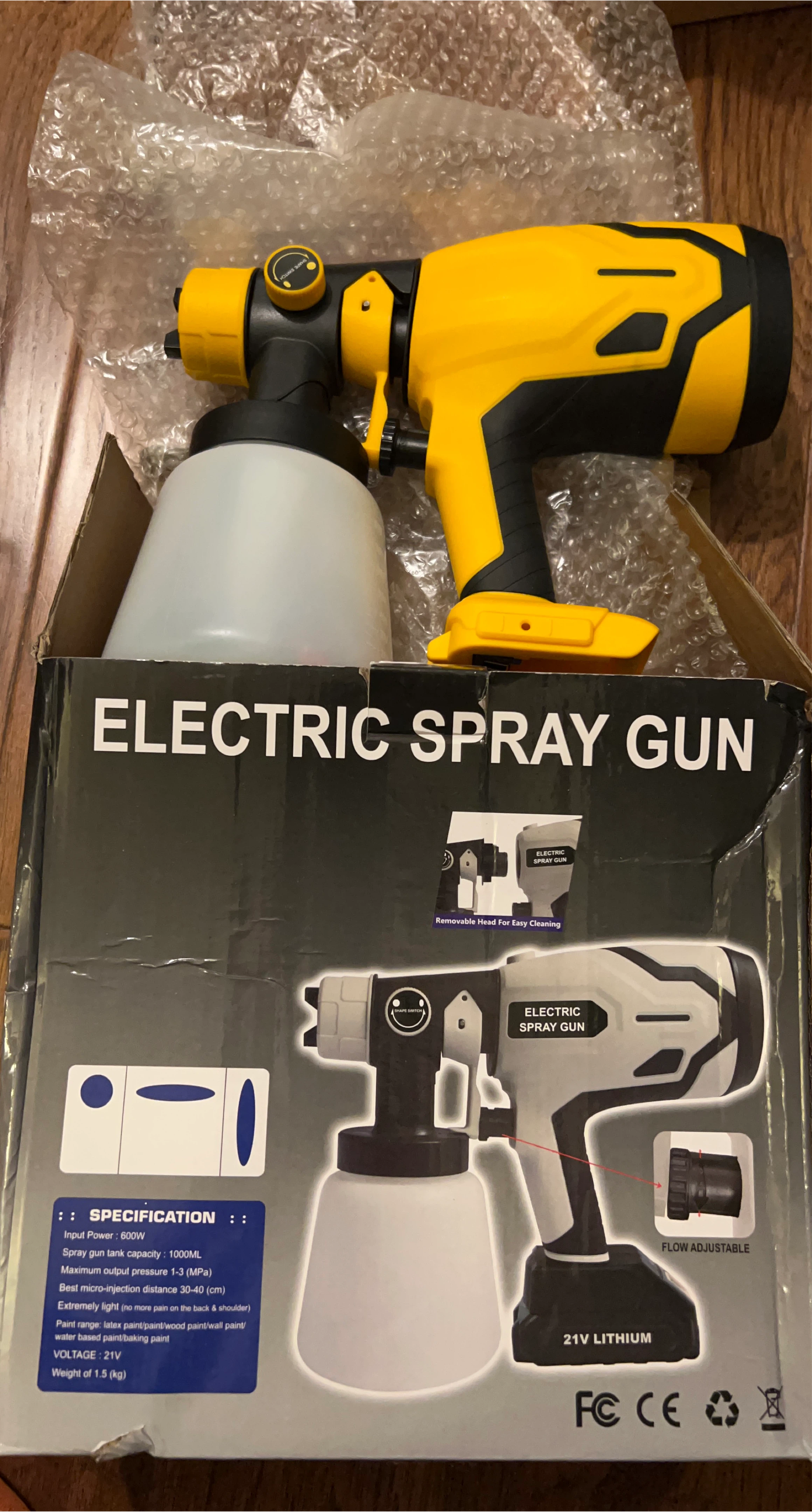 Selling an electric spray gun! It's in excellent condition and comes with the original box. Here are some of the specs: - Input Power: 600W - Spray gun tank capacity: 1000ML - Maximum output pressure: 1-3 (MPa) - Best micro-injection distance: 30-40 cm - It's also extremely light, so it won't hurt your back or shoulders - Suitable for latex paint, wood paint, wall paint, water-based paint, and baking paint - Voltage: 21V - Weight: 1.5 kg