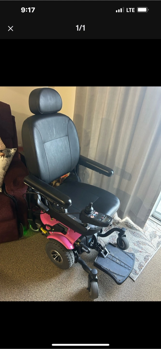 Selling an electric wheelchair with a black seat and pink accents. It shows some signs of use on the seat, but is otherwise in good working condition. Great for mobility!