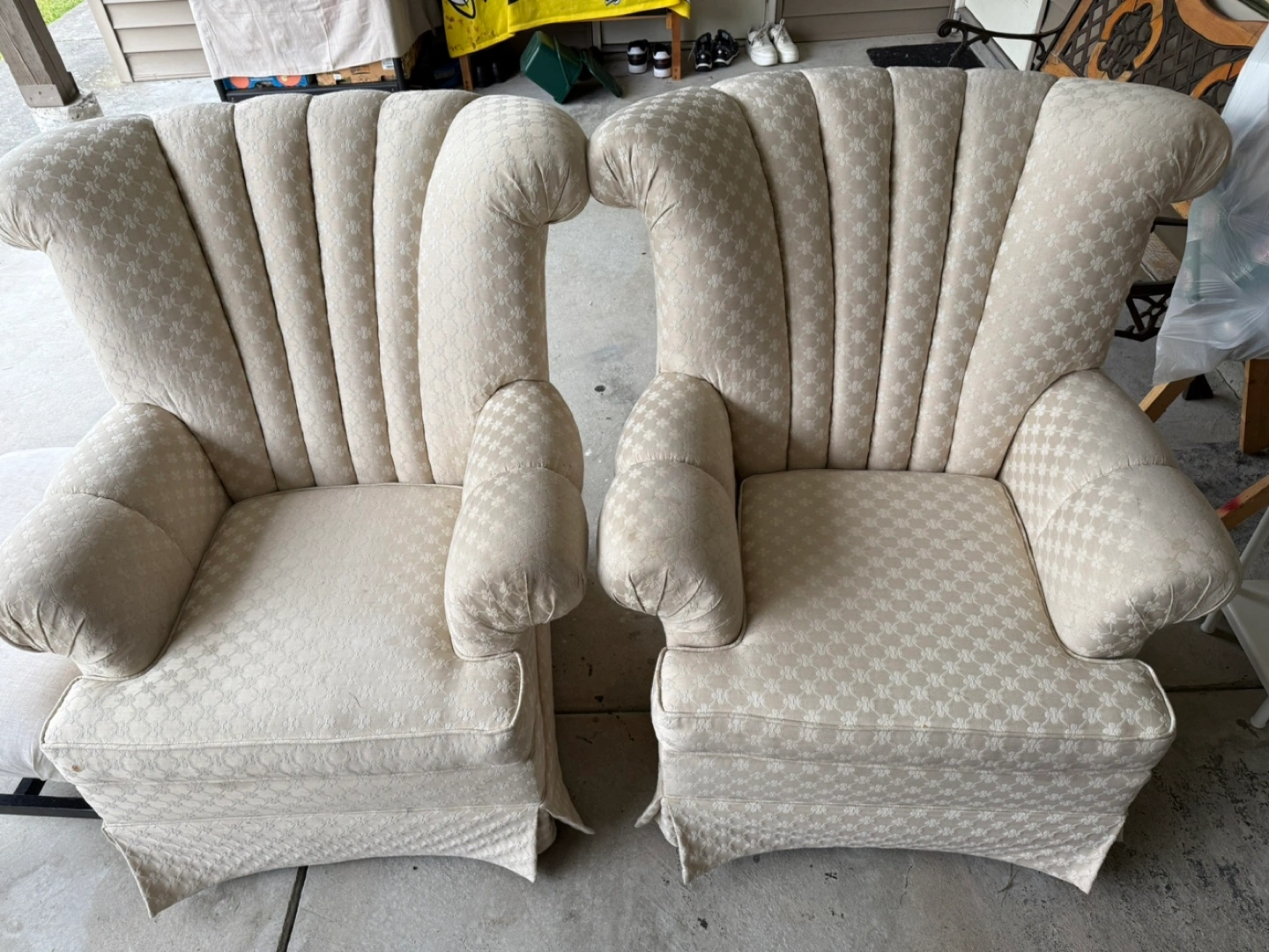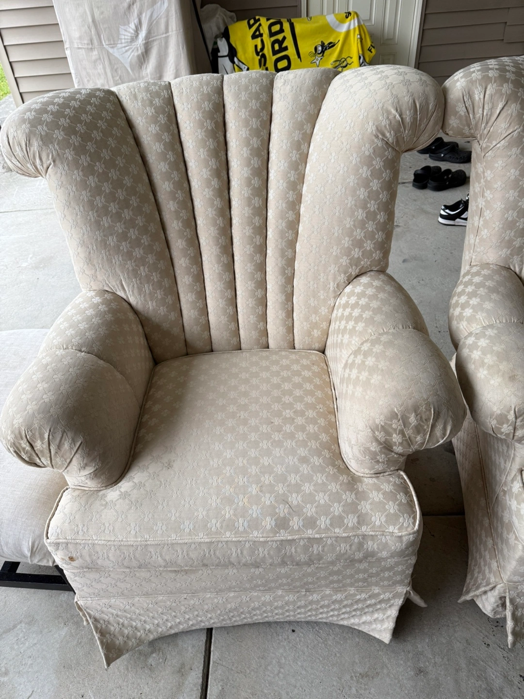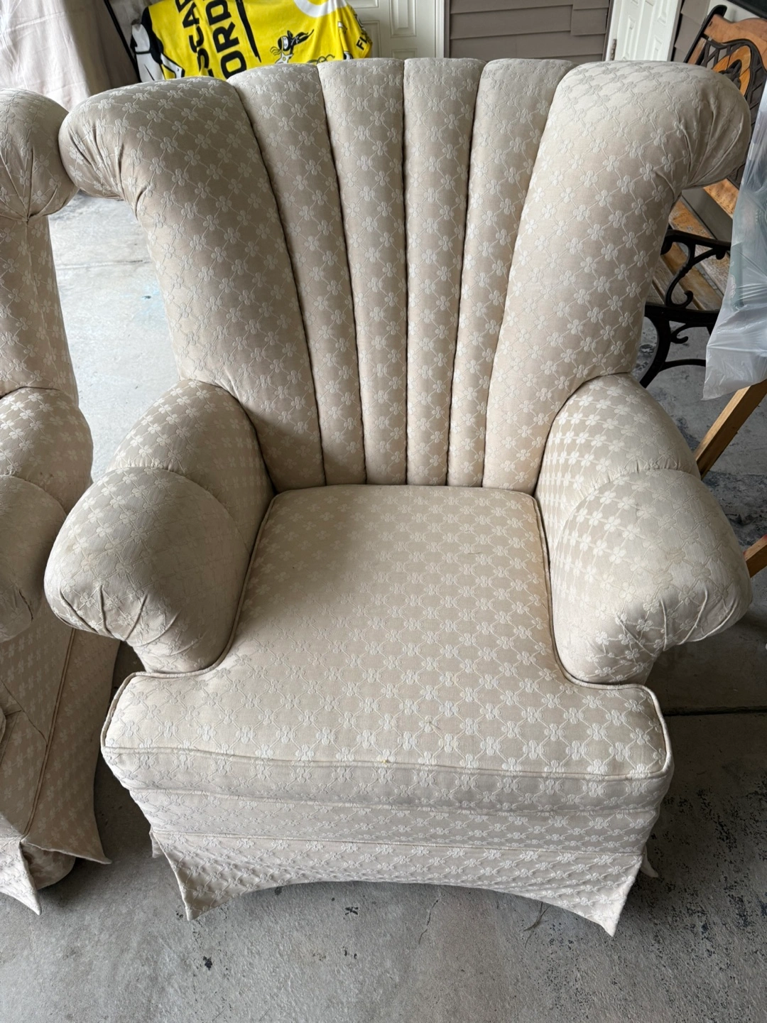 Here's a lovely armchair with a unique upholstered design! The fabric is a neutral beige colour, making it a versatile piece for any living space. It has a high back and comfortable armrests, perfect for relaxing. This chair would be a great addition to your home!