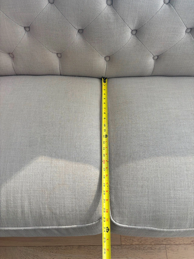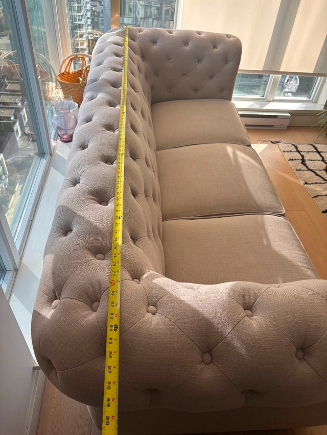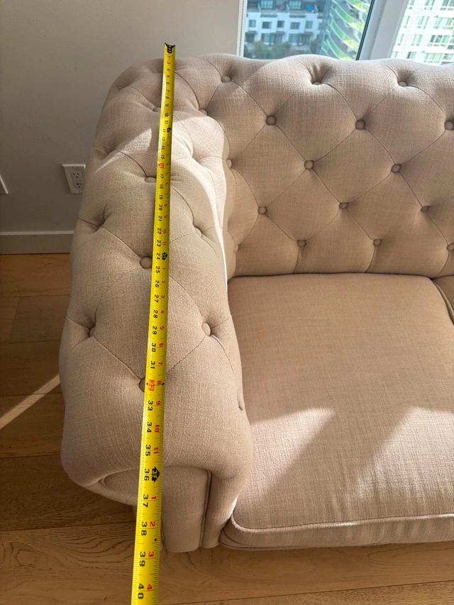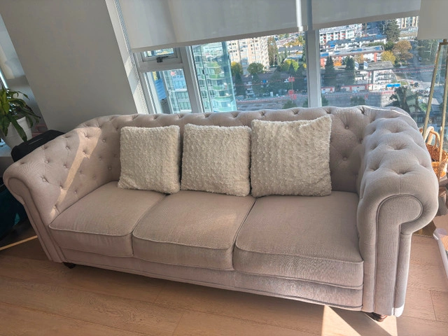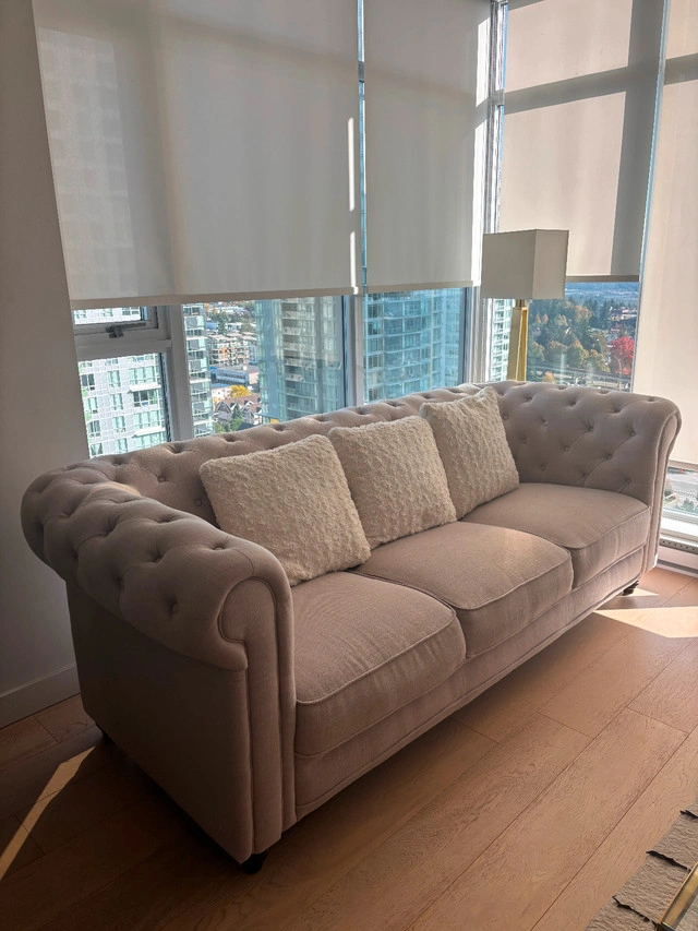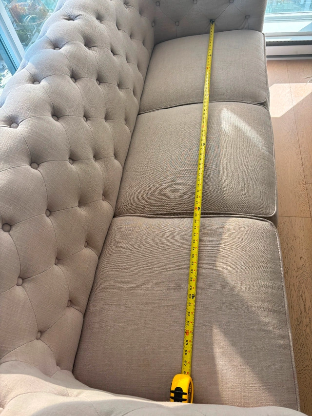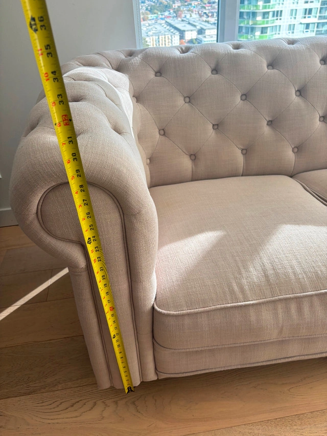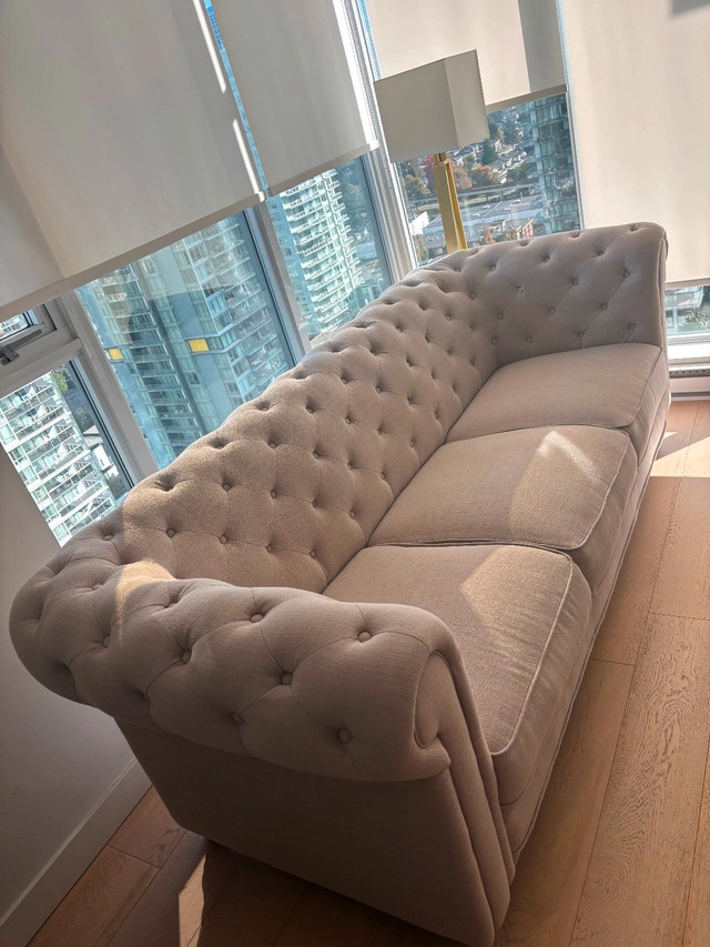 This sophisticated tufted Chesterfield-style sofa combines traditional charm with modern comfort. Its deep button-tufted back and arms, rolled silhouette, and neutral beige upholstery make it a stunning centerpiece for any living room. The frame is solid and sturdy, with plush, supportive cushions for everyday comfort. The fabric is in great condition — only two minor water stains on the seat cushions that can be easily removed with a professional cleaning (no rips, sagging, or fading). Features: • Classic Chesterfield silhouette with deep tufting • Neutral beige upholstery (works with any color scheme) • Rolled arms and cushioned seats for comfort • Sturdy hardwood frame and solid construction • Elegant, timeless style that suits both modern and traditional interiors (approx.): Length: 84” Depth: 36” Height: 29” Seat Height: 18” Condition: Excellent structural integrity, minor cosmetic water marks that can be professionally removed. Pickup in Burnaby (Metrotown area)