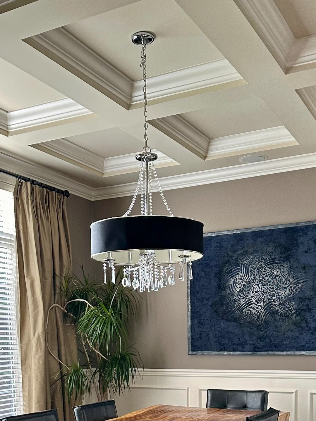 0Add a touch of elegance to your dining room or living space with this beautiful chandelier! It features a black drum shade with chrome accents and crystal pendants. Perfect for creating a warm and inviting atmosphere in your home
