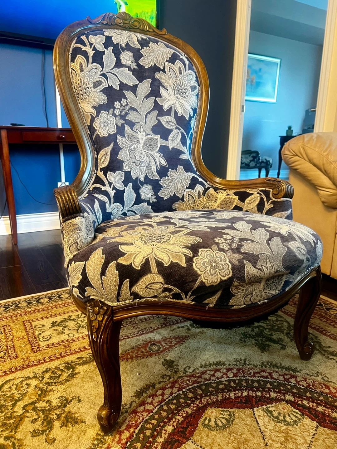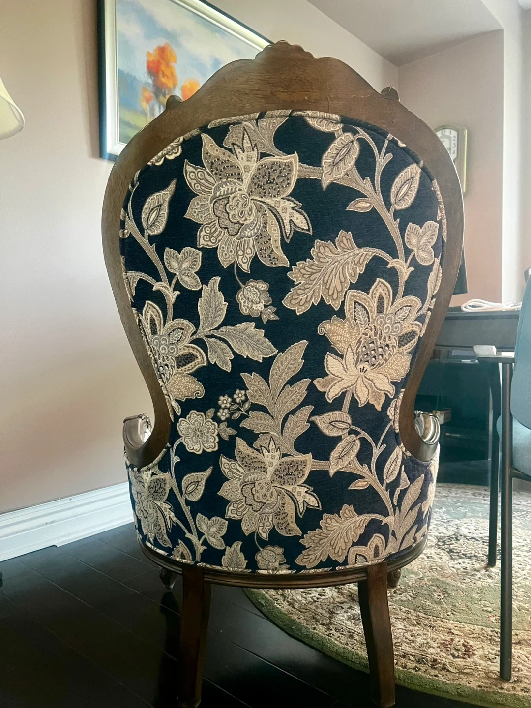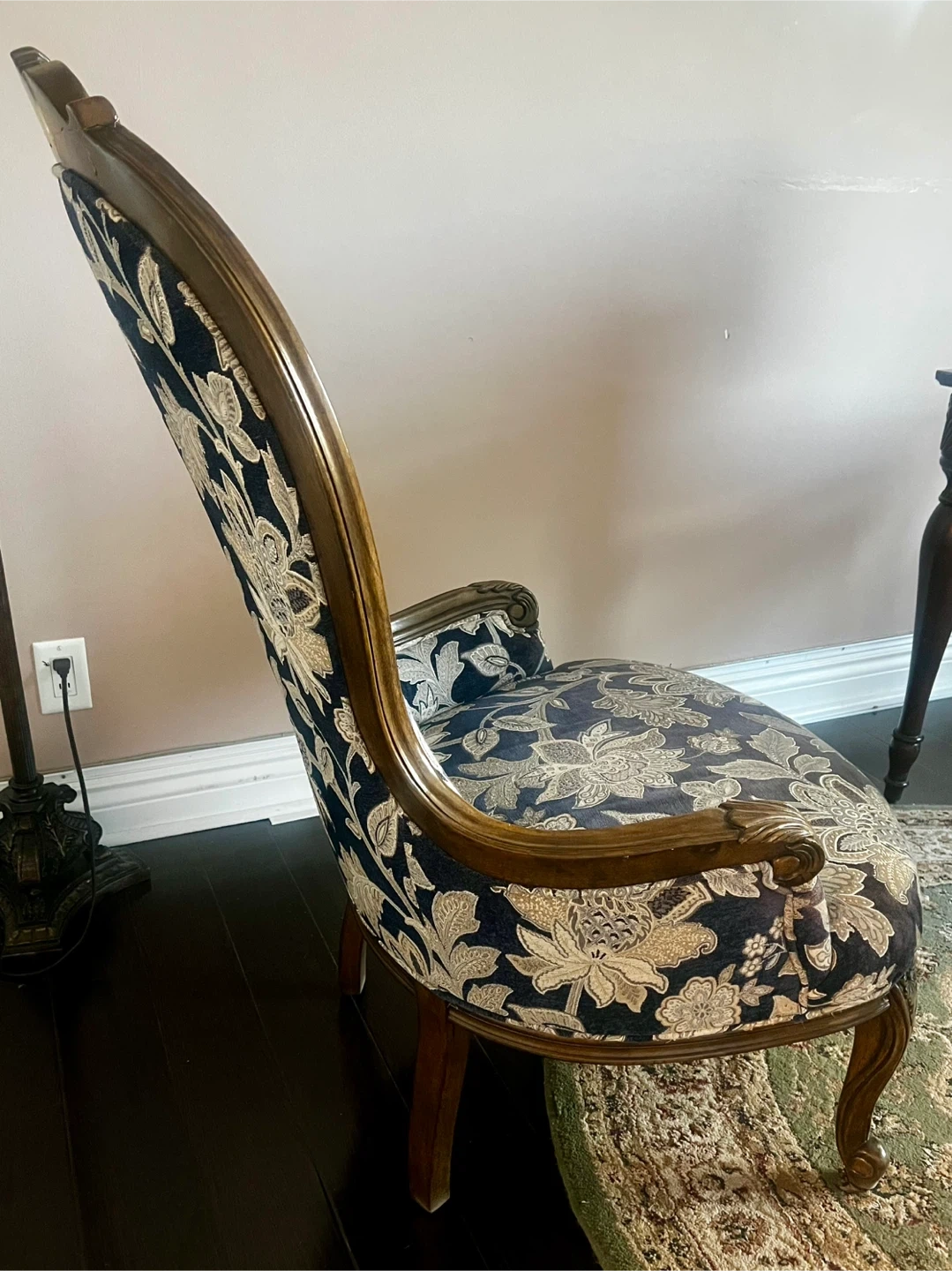 Add timeless charm to your home with this beautiful pair of Bombay accent chairs. ✔️ Solid wood frame with intricate carved detailing ✔️ Upholstered in a rich navy fabric with elegant floral embroidery ✔️ Comfortable high-back design with curved arms ✔️ Excellent craftsmanship, sturdy and stylish ✔️ Perfect for a living room, office, or reading nook 🛋️ Original retail price: approx. $500 each ($1,000 for the pair) 💲 Asking price: $450 for the pair (or $250 each) Condition: Gently used, in great shape Style: Classic/Vintage Bombay Collection